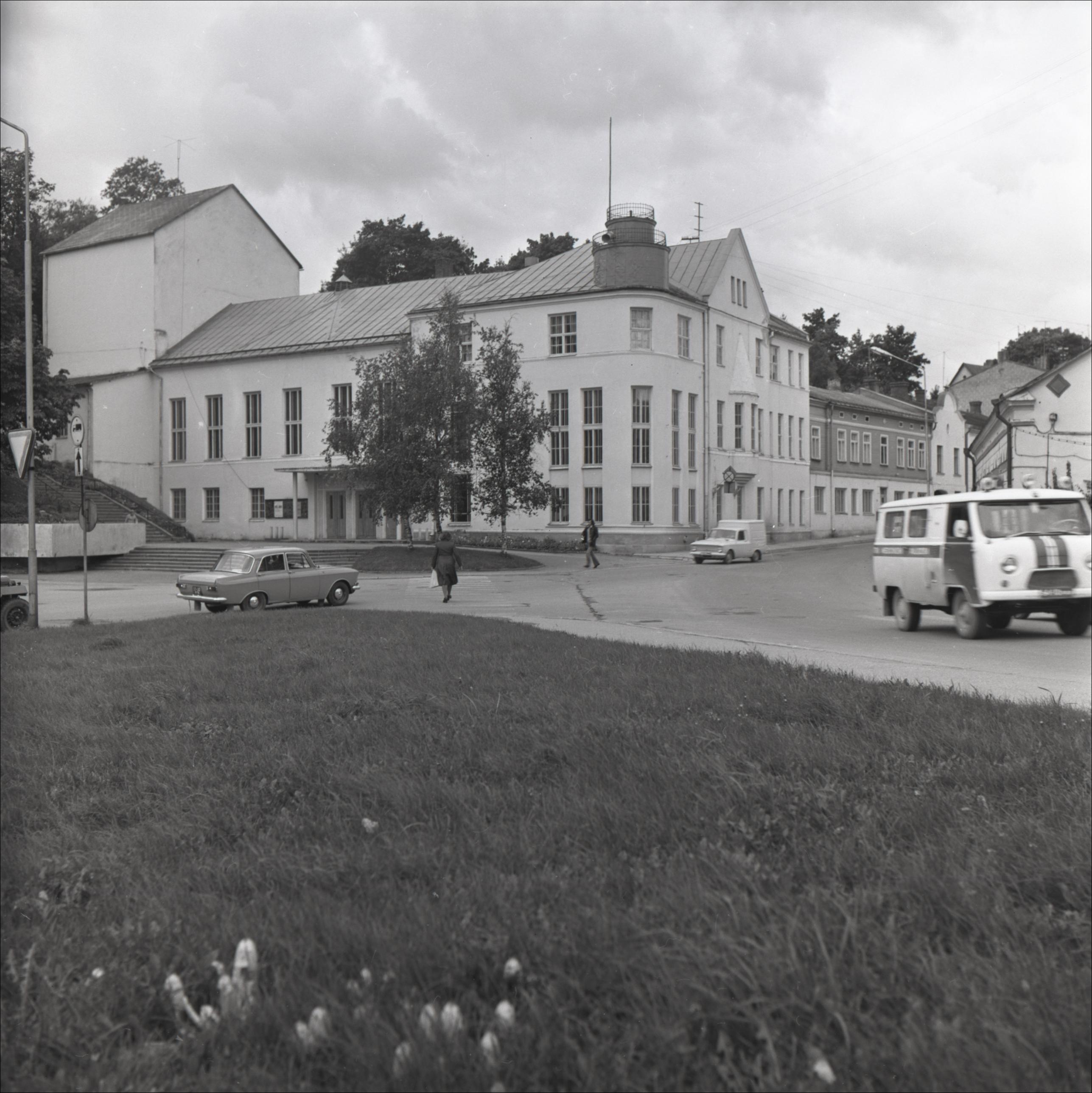 Kultūras nams: Fasādes, ieeja, ēkas priekšā bērzi, garām iet cilvēki, uz ielas automašīnas