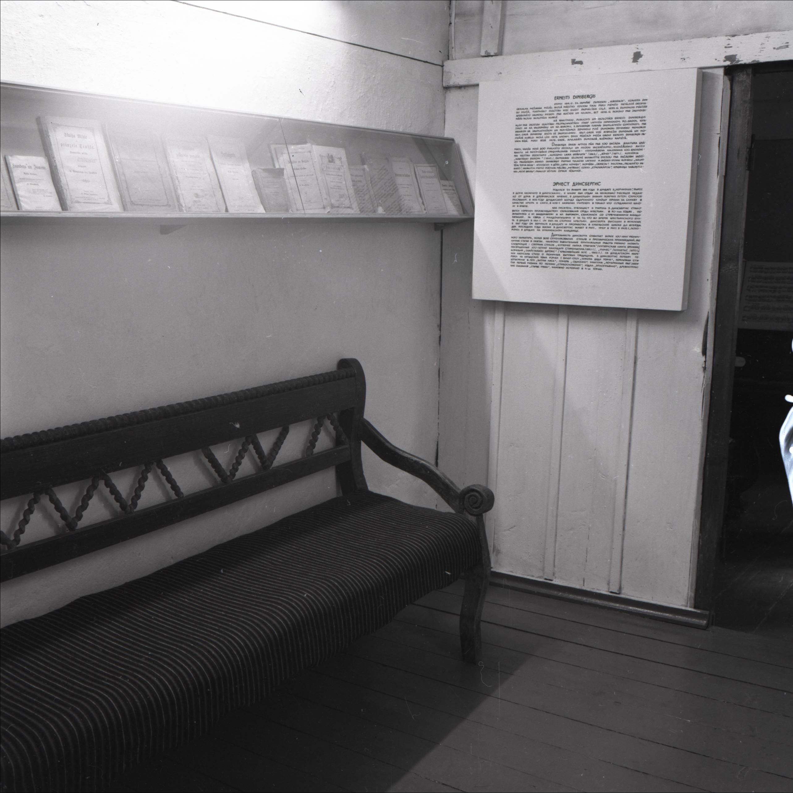 Skola, kurā strādājis Ernests Dinsbergs: Iekštelpas – muzeja ekspozīcija par Ernestu Dinsberģi (Dinsbergu). Planšete ar tekstu, iestikotas grāmatas. Krēsls.