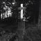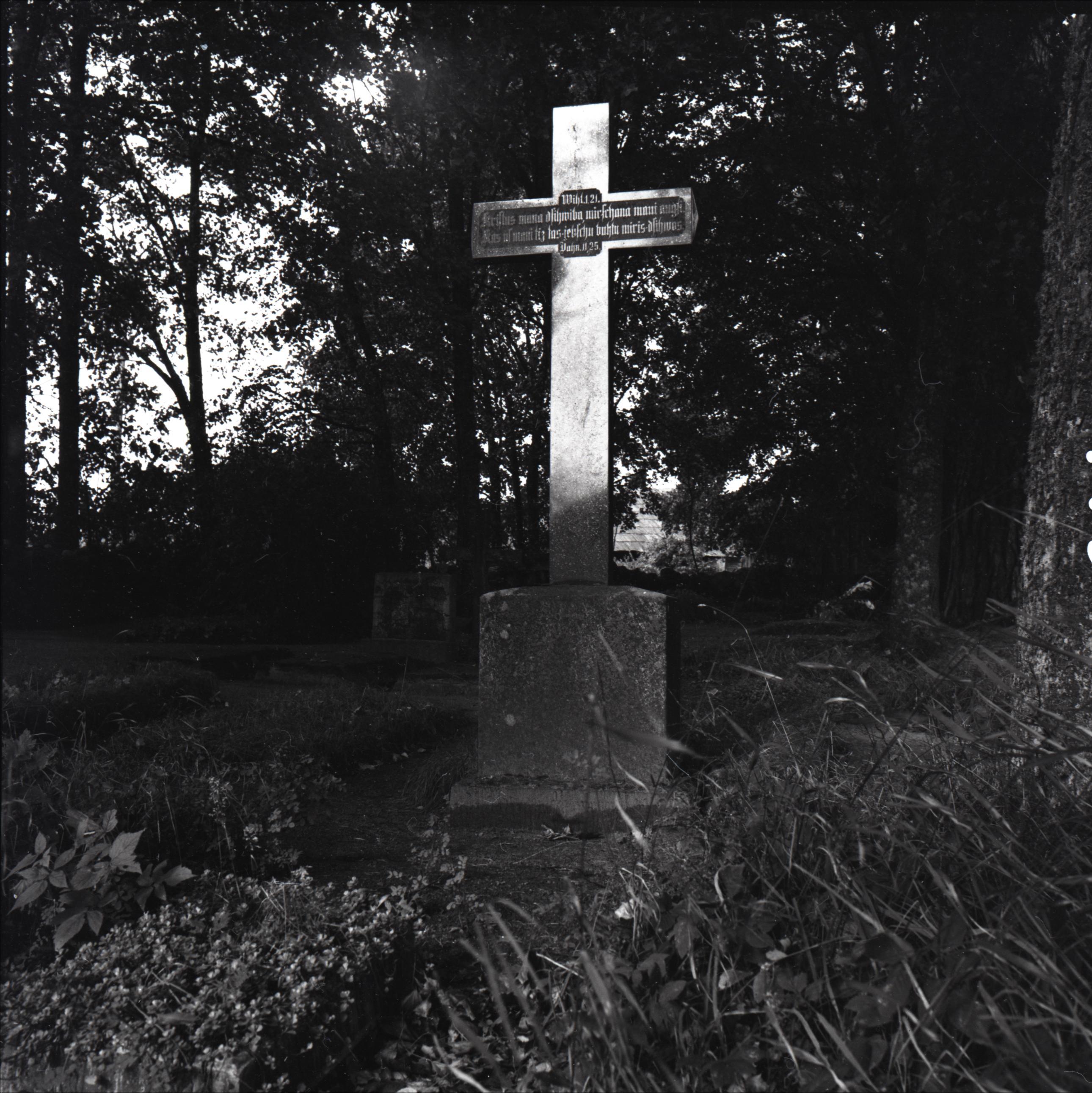 Ernesta Dinsberga kaps: Kapa piemineklis krusta formā, uz tā uzraksts vecajā drukā. Fonā koks, citas kapa vietas