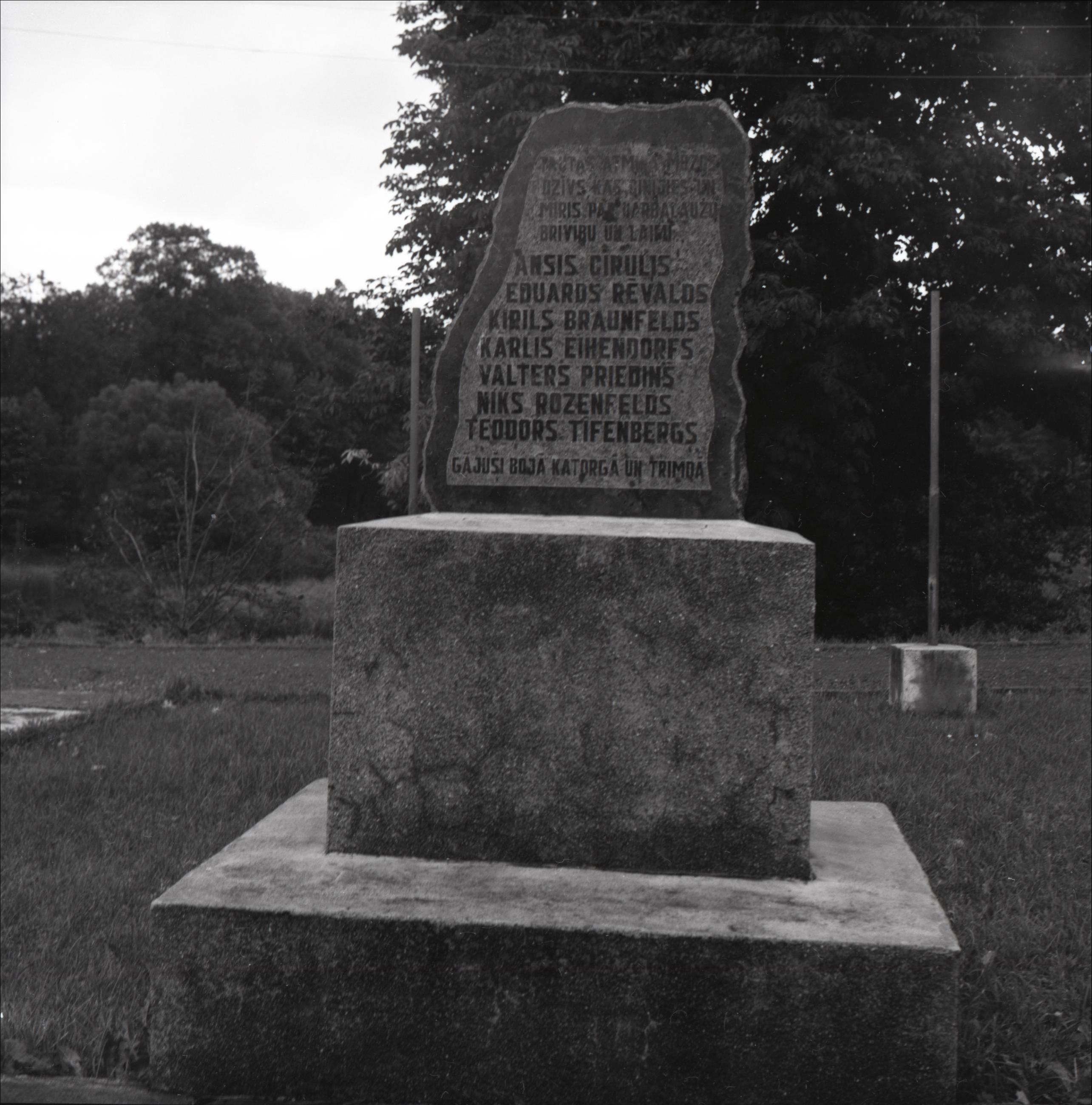 Piemineklis 1905. gadā bojā gājušajiem revolucionāriem: Piemineklis uz paaugstinājuma, uz tā kritušo vārdi, fonā koki