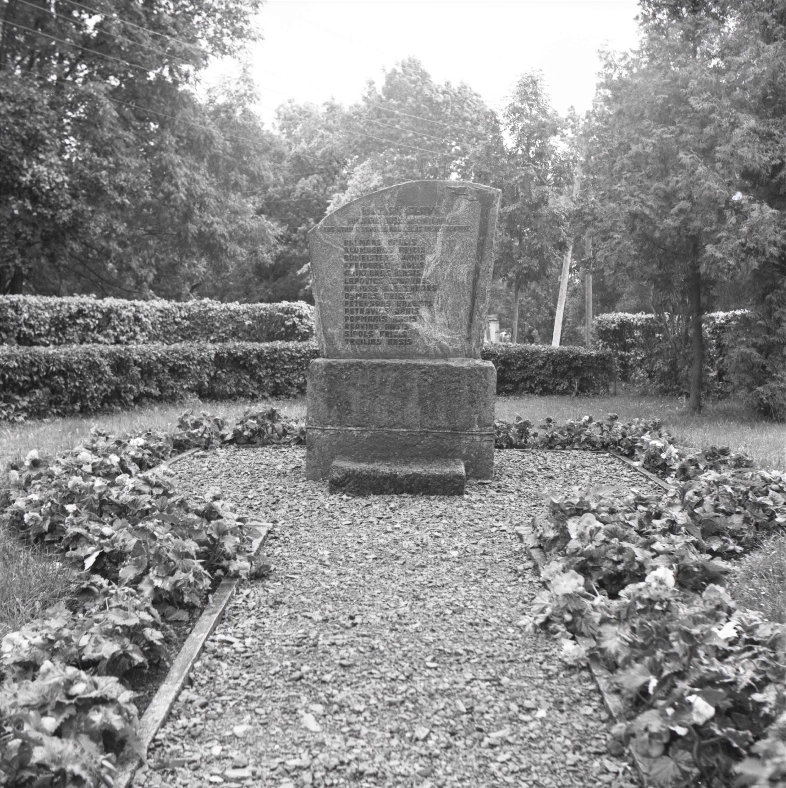 Piemineklis 1905. gada cīnītājiem: Piemineklis uz paaugstinājuma, uz tā kritušo vārdi, fonā apstādījui, krūmi, koki