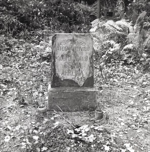 Kapa piemineklis Bertai Arkliņai: Kapa piemineklis, uz tā uzraksts "Atdeva dzīvību par padomju varu Berta Ārkliņa". Fonā citas kapa vietas, apstādījumi