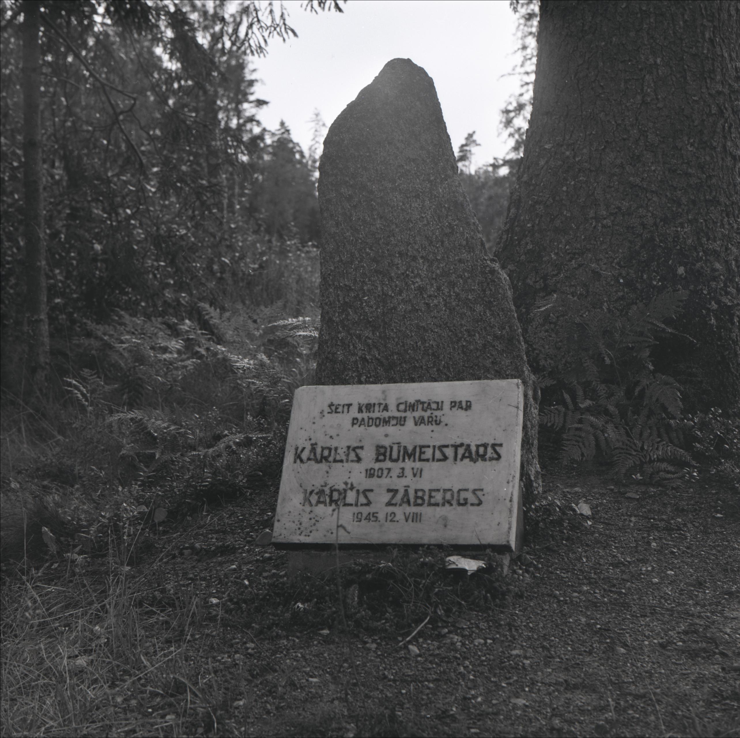 Soda egle: Piemineklis, uz tā piemiņas plāksne. Informē, ka šeit krituši Kārlis Būmeistars un Kārlis Zābergs. Fonā koka stumbrs, mežs