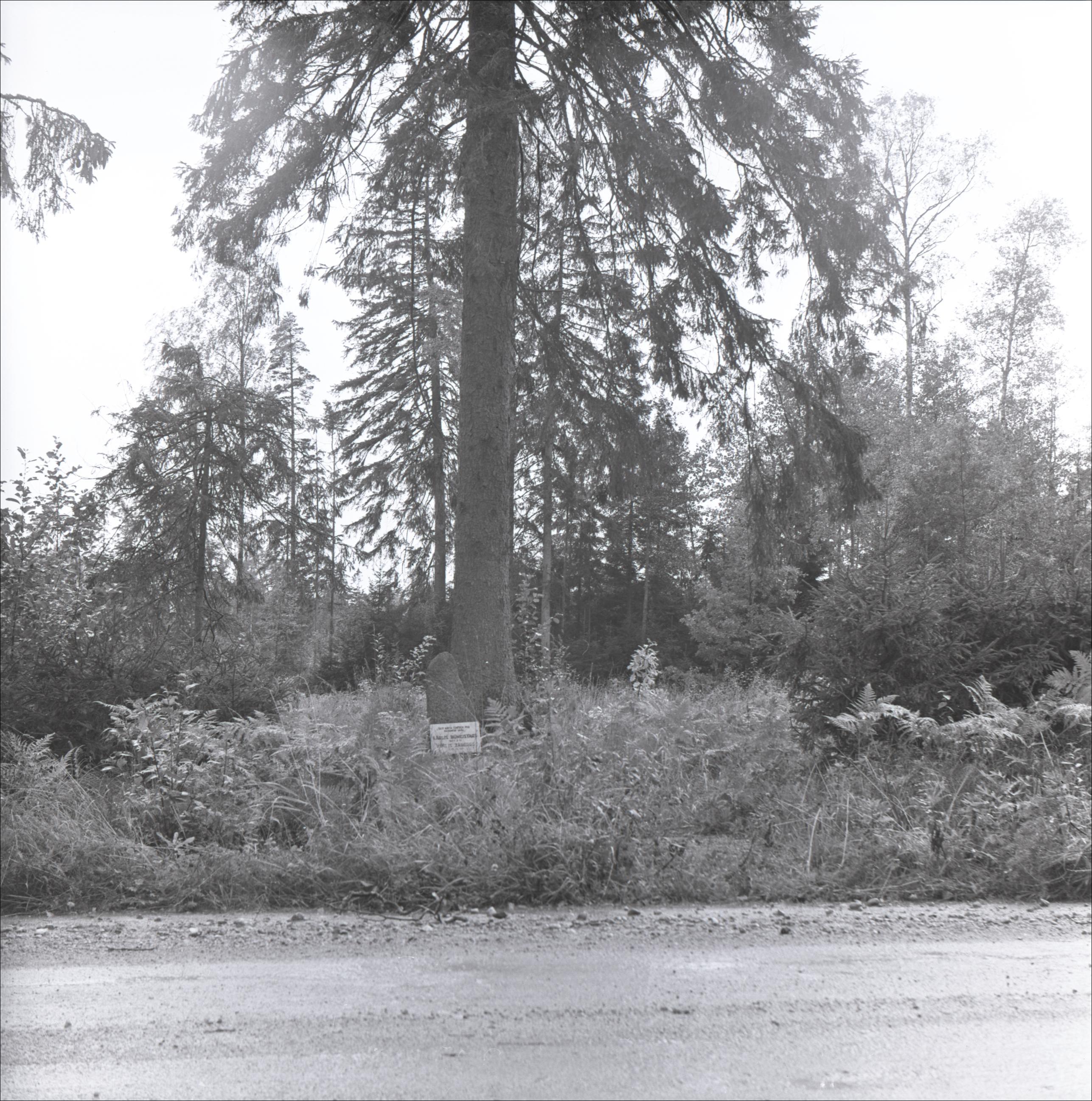 Soda egle: Egle, pie tās piemineklis ar piemiņas plāksni. Fonā koki, priekšplānā grants ceļš