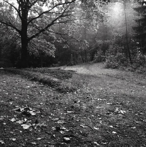 Nacistiskās Vācijas upuru kapi Sukturu kapos: Obelisks, apstādījumi, fonā koki