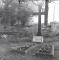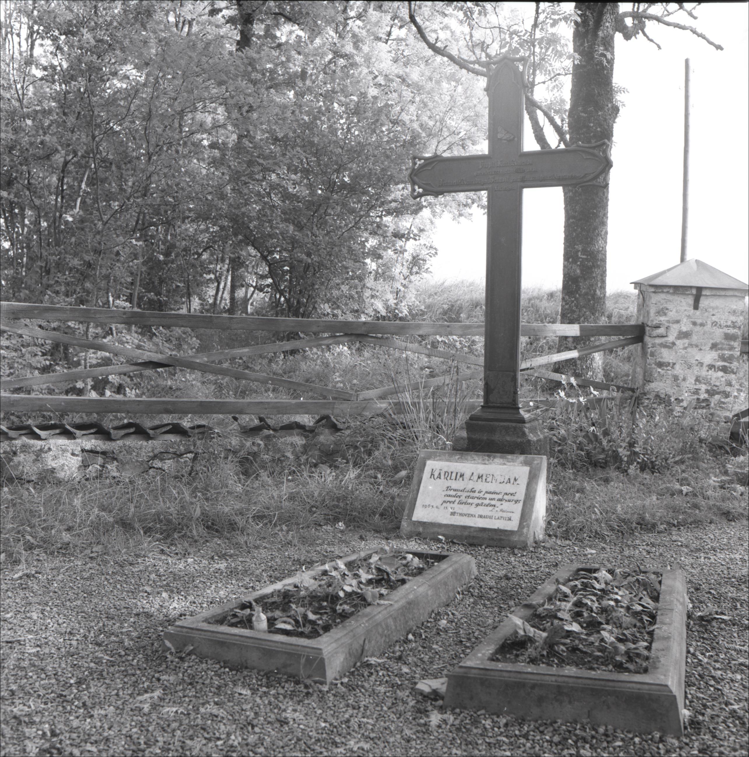 Kārļa Amendas kaps: Kapa piemineklis krusta formā, piemiņas plāksne, divas kapa vietas, fonā koka sēta ar mūrētu stabu
