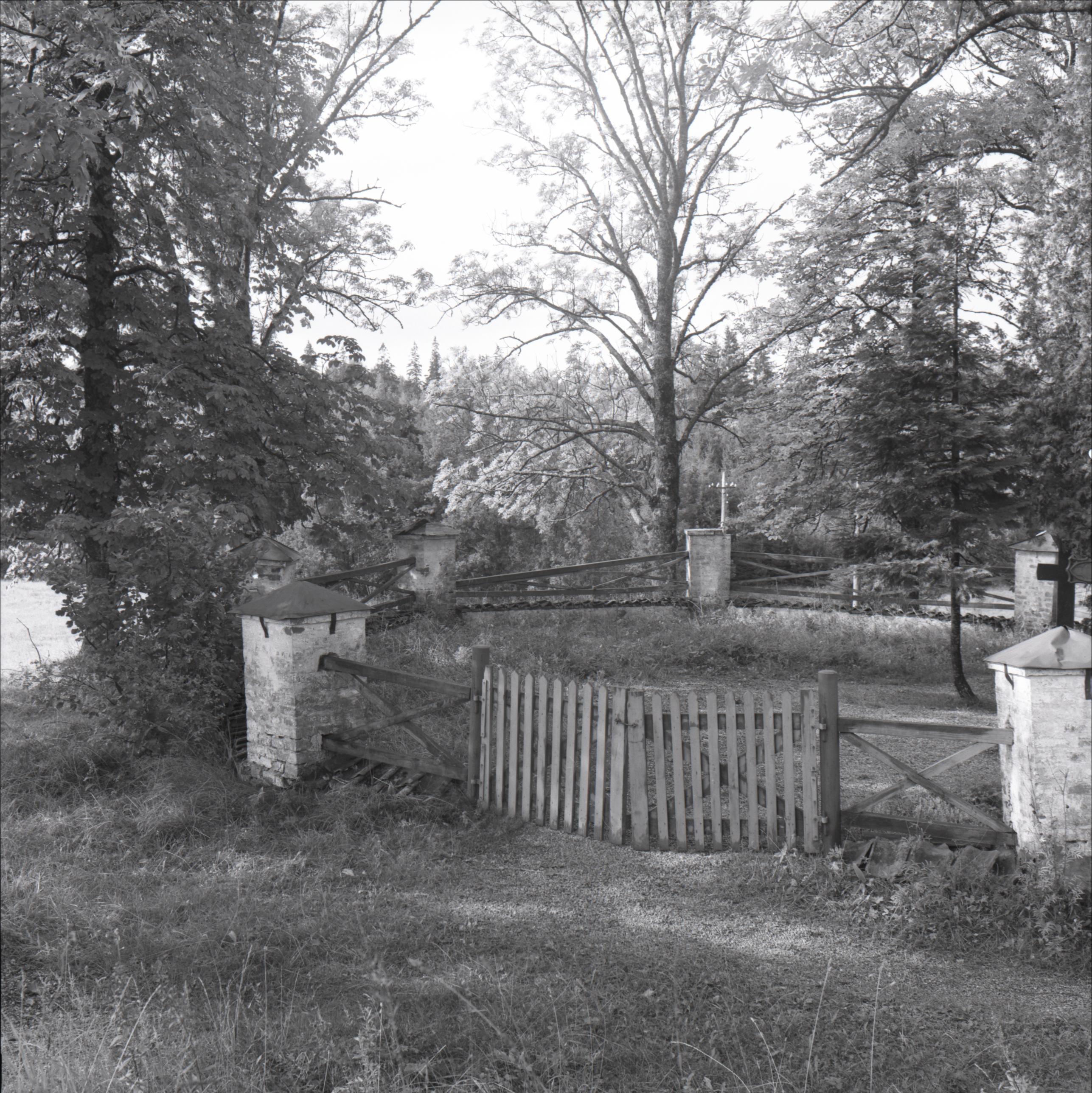 Kārļa Amendas kaps: Ieejas vārti no koka, koka sēta ar mūrētiem stabiem, apkārt koki