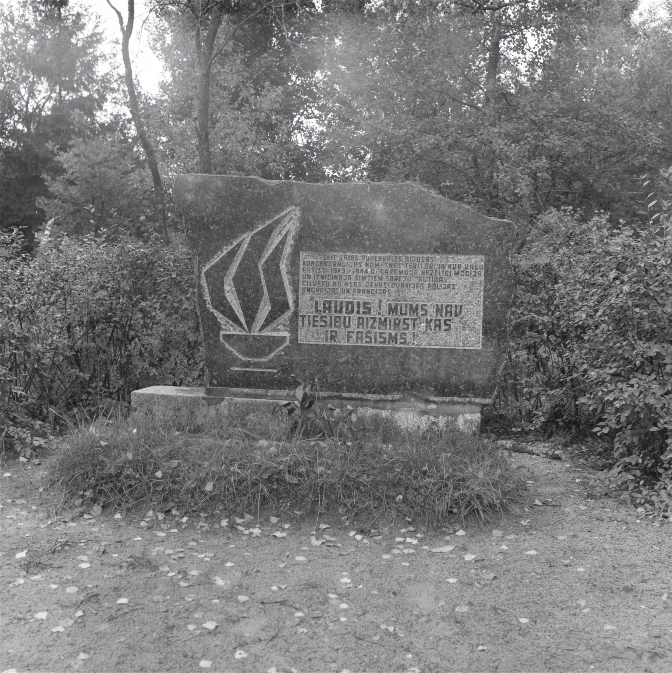 Popervāles koncentrācijas nometnes vieta: Piemineklis ar attēlotu uguni un uzrakstu "Ļaudis mums nav tiesību aizmirst", fonā krūmi, koki
