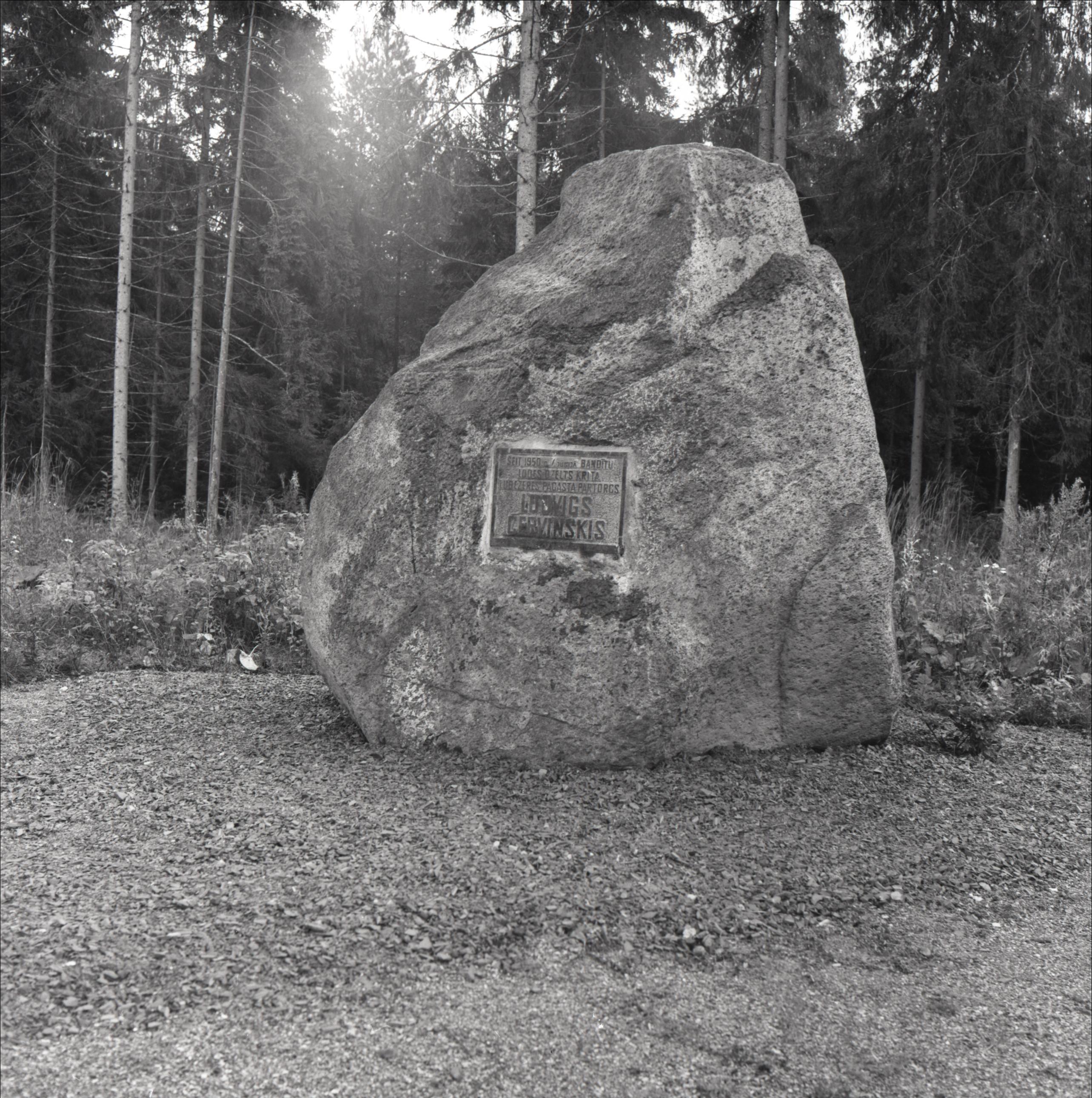 Kārļa Ludviga Červinska noslepkavošanas vieta: Akmens piemineklis, tā centrā piemiņas plāksne. Fonā mežs