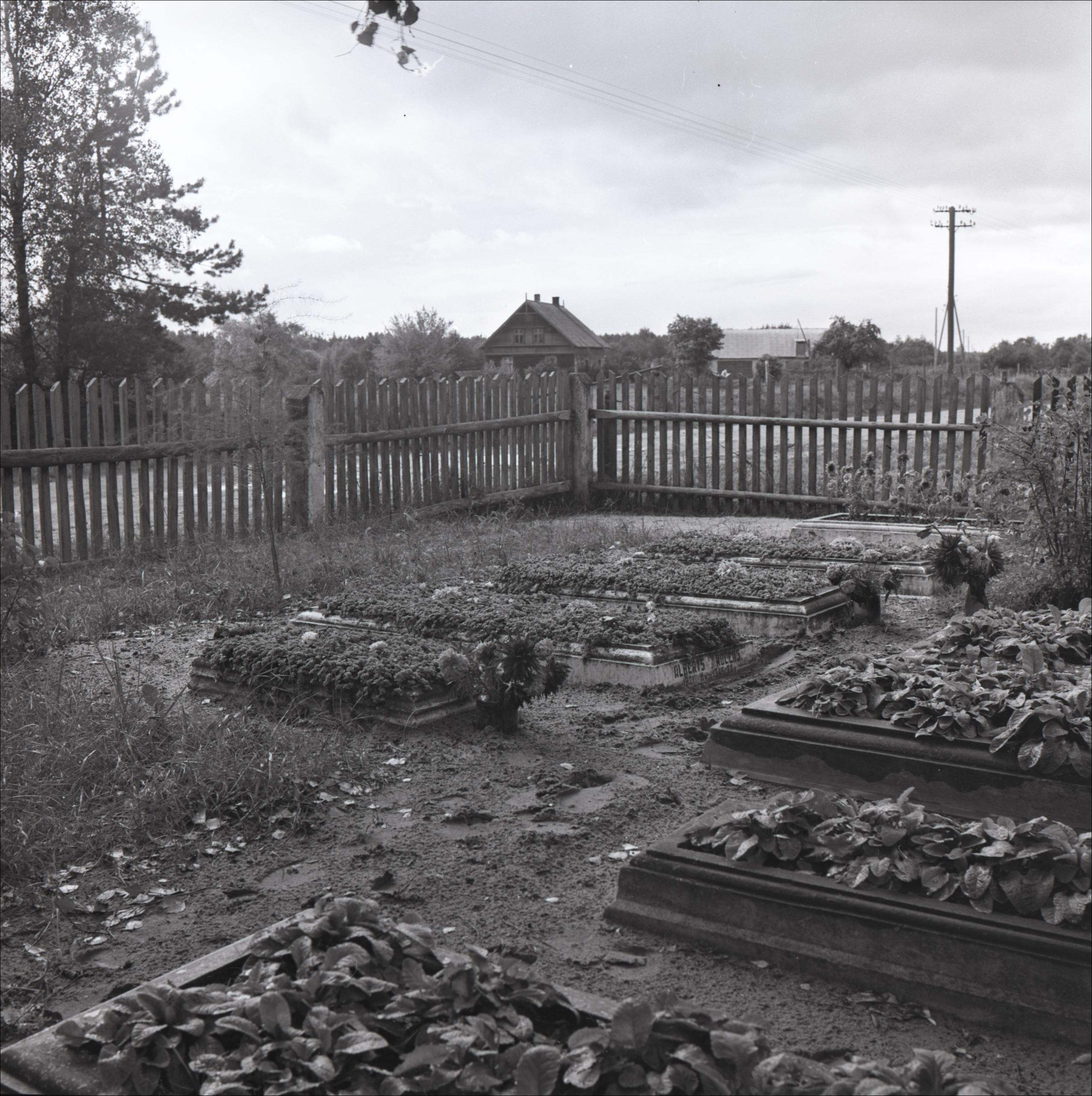 Alberta Kocera kaps Upesgrīvas kapos: Daudzas kapa vietas ar apstādījumiem. Iežogotas ar koka sētu, aiz tās iela un dzīvojamās ēkas