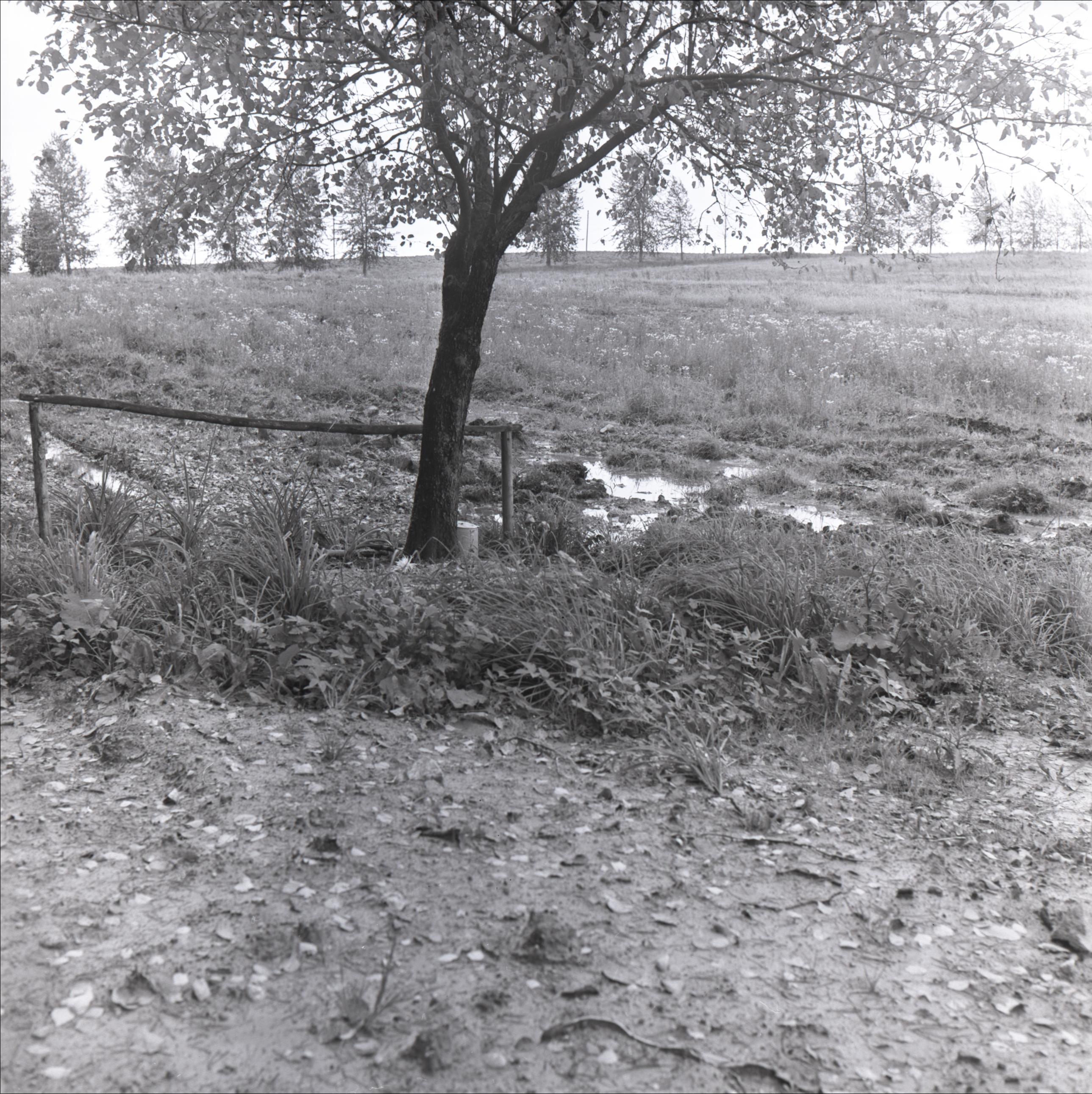 1919. gadā nogalinātā A. Paipalas kaps: Koks, aiz tā neliels koka nožogojums, applūdusi pļava