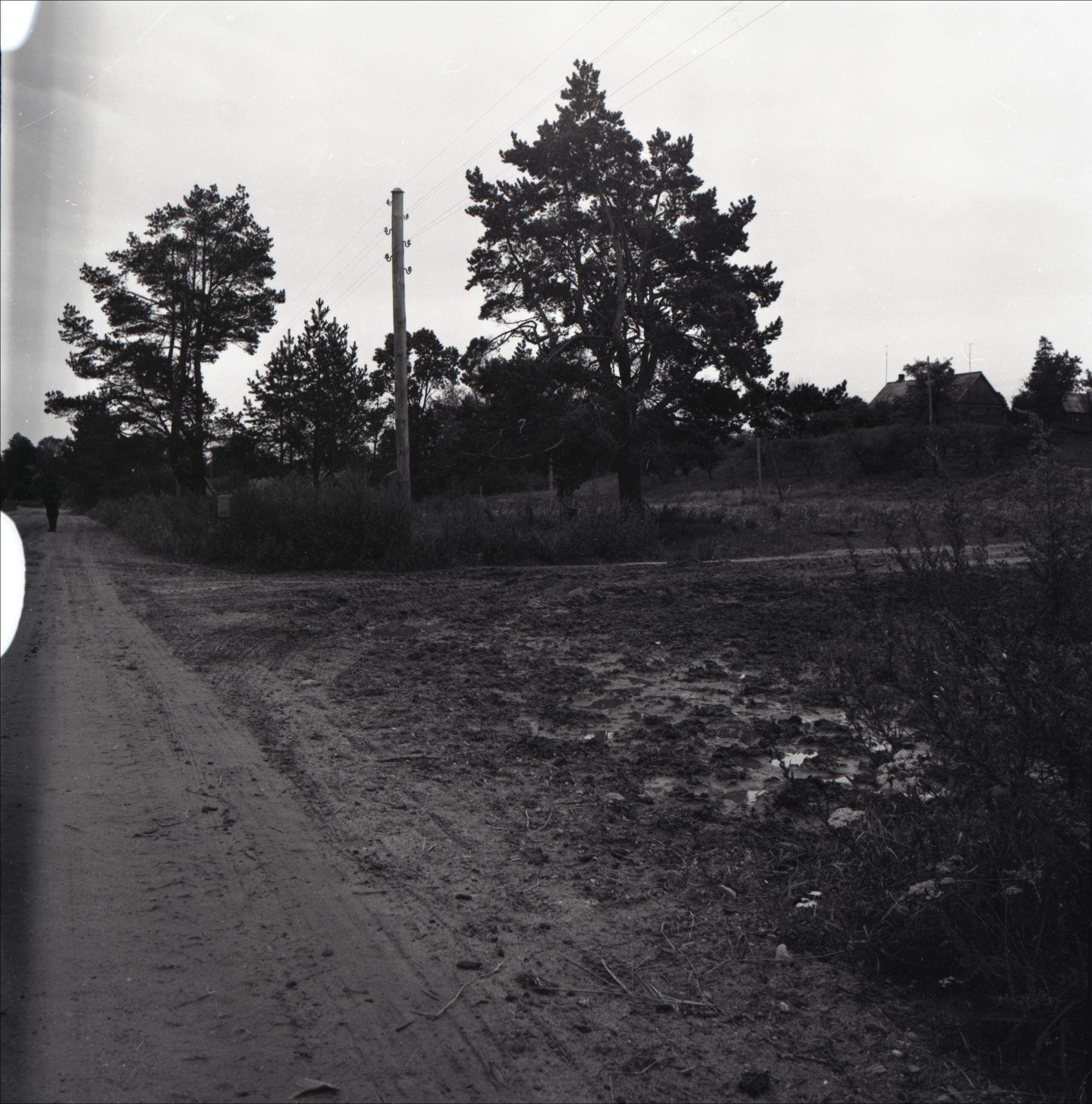 Kretulievu piemiņas vieta: Lauku ceļu krustojums, koki, elektrības stabs, tālumā ēka. Uz ceļa cilvēks. Negatīva kreisajā strūrī defekti pusapļa formā
