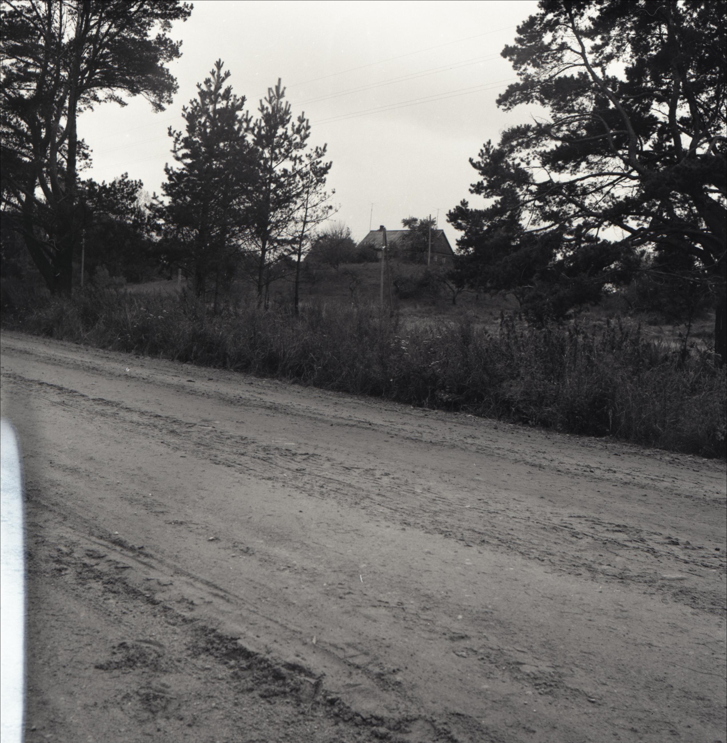 Kretulievu piemiņas vieta: Lauku ceļš, koki, elektrības stabs un vadi, tālumā ēka. Negatīva kreisajā stūrī defekts