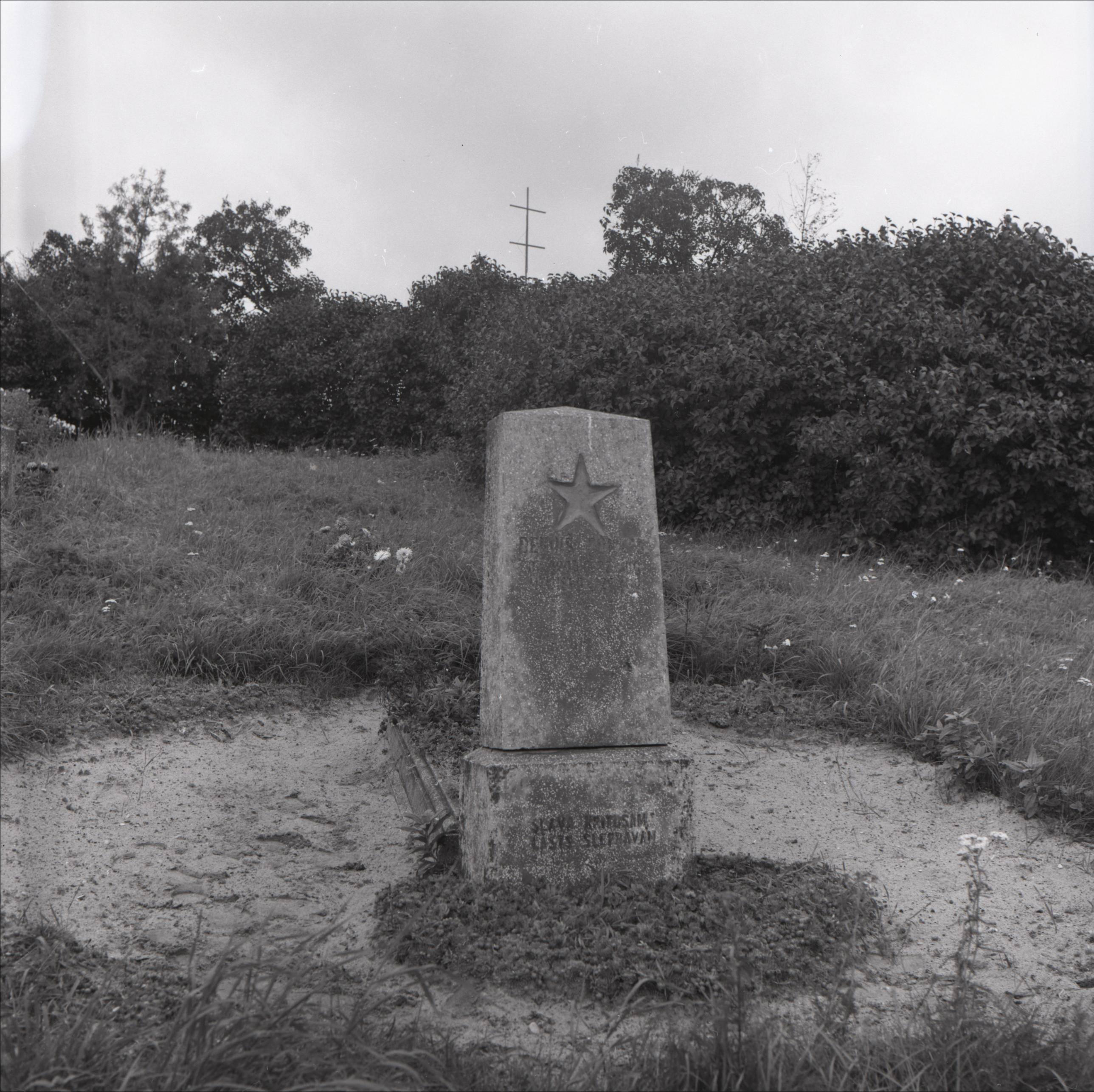 D. Deniņa kaps Krievukroga kapos: Kapa piemineklis ar zvaigzni un uzrakstu "Slava kritušajiem, lāsts slepkavām". Aiz pieminekļa kapa vieta ar apstādījumiem, ap pieminekli smilts, tālāk zāle, krūmi