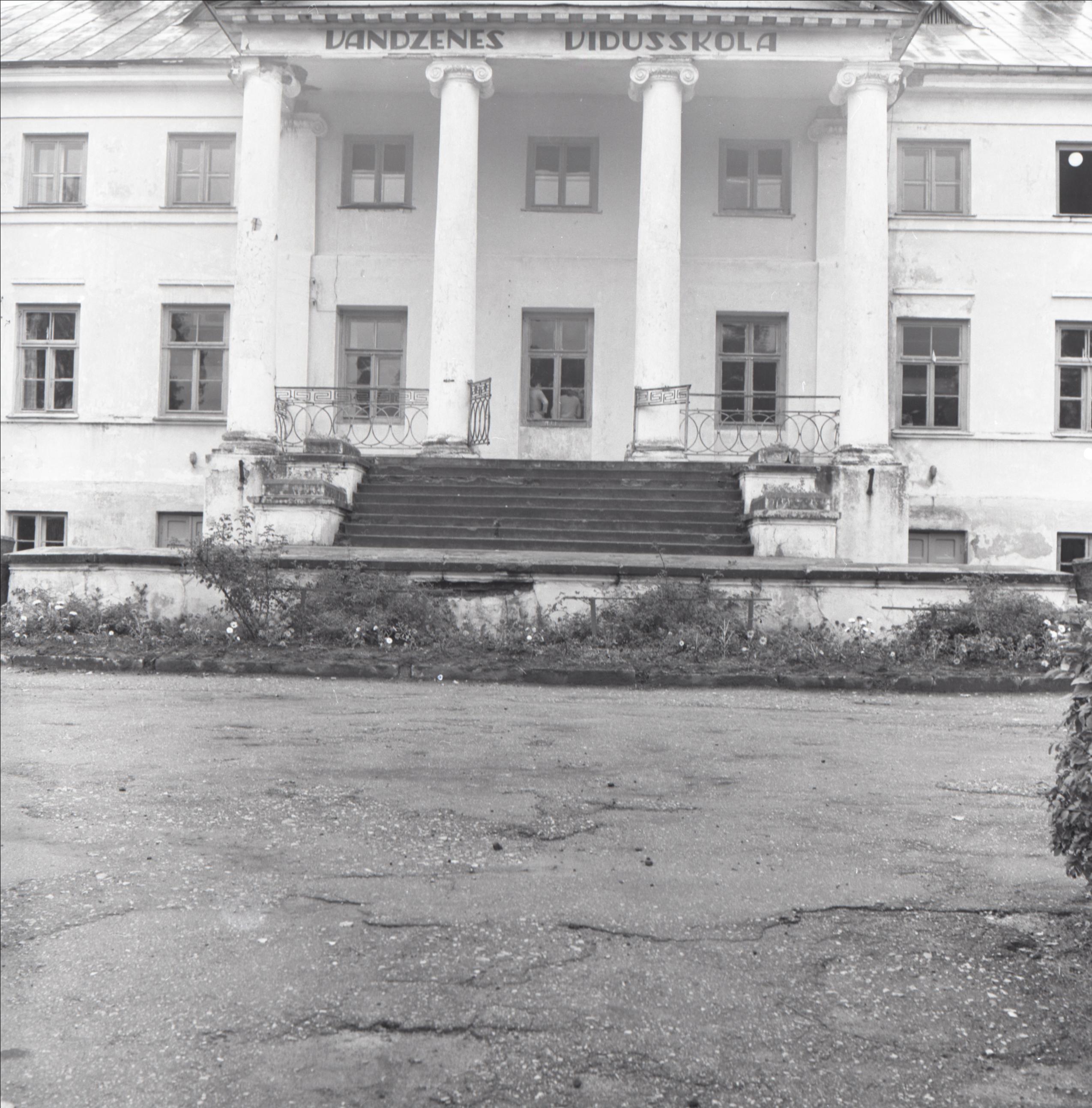 Vandzenes muiža: Skolas kāpnes, vārti, fasāde, uz fasādes uzraksts "Vandzenes vidusskola" kāpņu pakājē