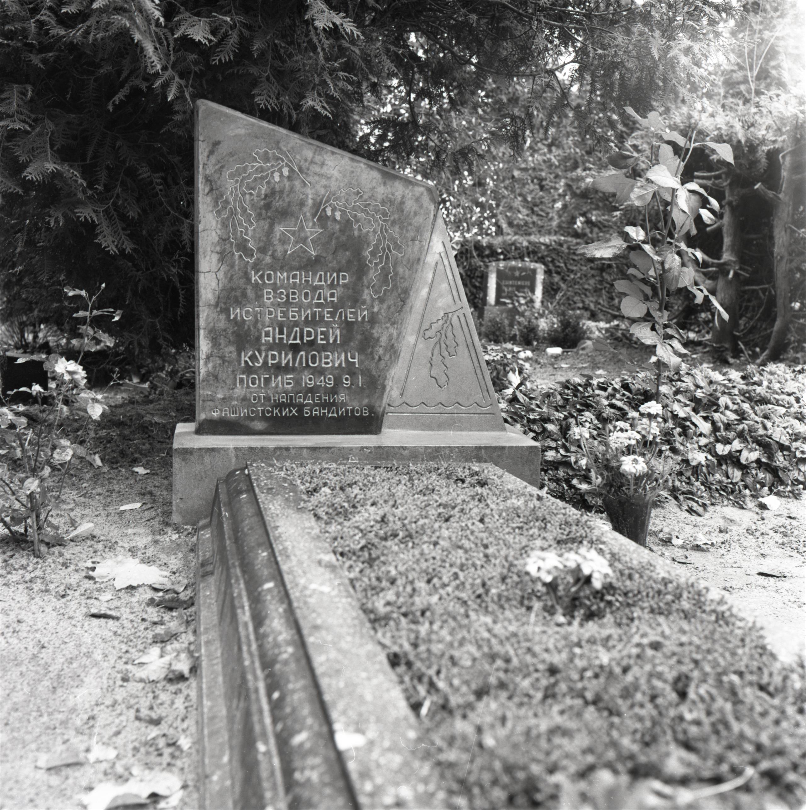 Odriņu kapi: A. Kuriloveca kapa vieta un piemineklis, tuvplāns. Piemineklī iegravēta piecstaru zvaigzne un ozollapu zari