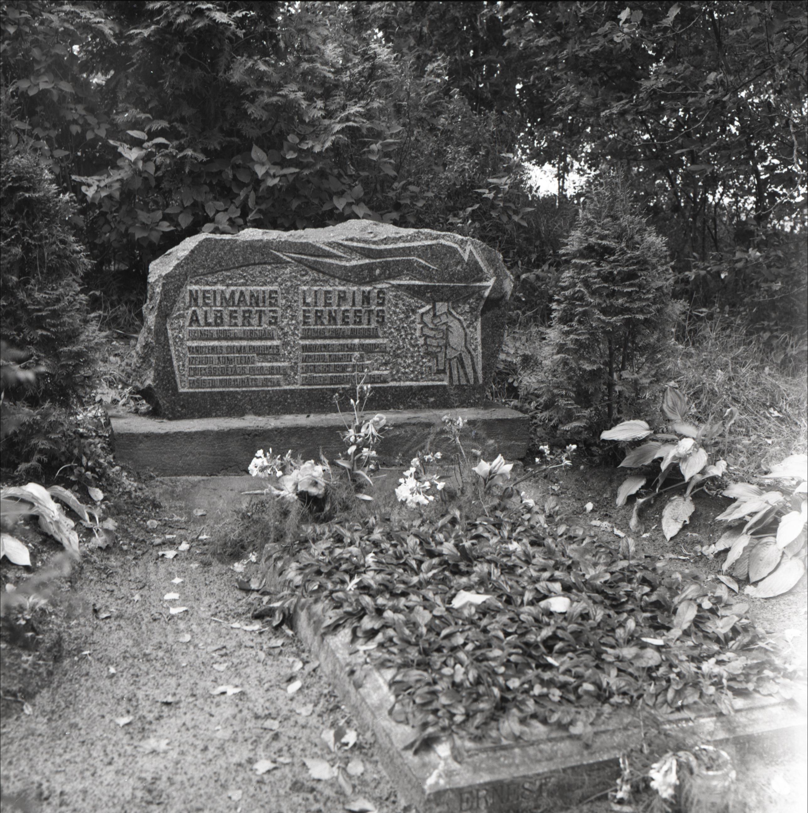 Odriņu kapi: Neimaņa un Liepiņa kapa vieta un pieminekli. Uz kapa iegravēta roka, kas tur lāpu