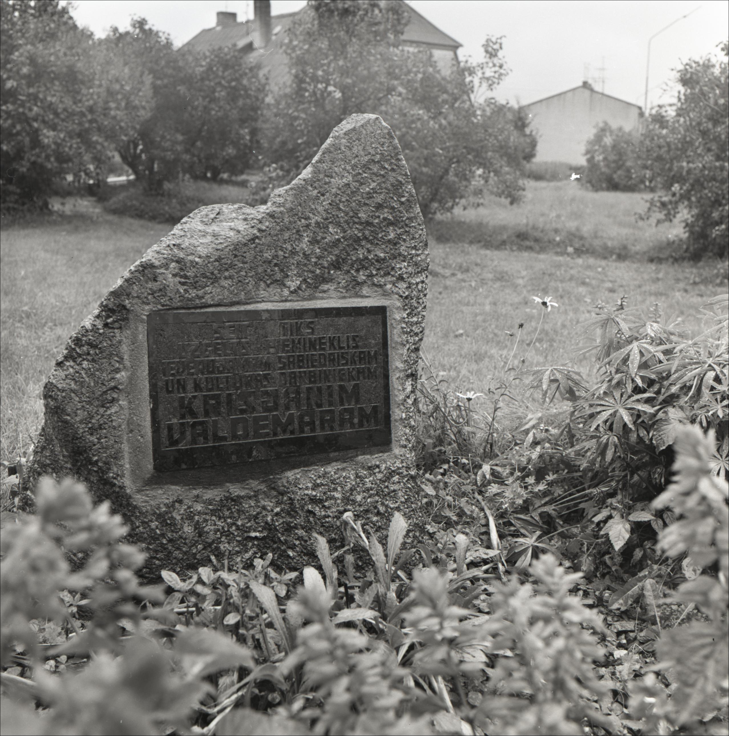 Piemiņas akmens: Piemiņas akmens vietā, kur pacelsies piemineklis Krišjānim Valdemāram, piemiņas akmens tuvplāns ar akmenī iegrebtu tekstu, fonā redzama Valdemārpils sinagogas draudzes māja