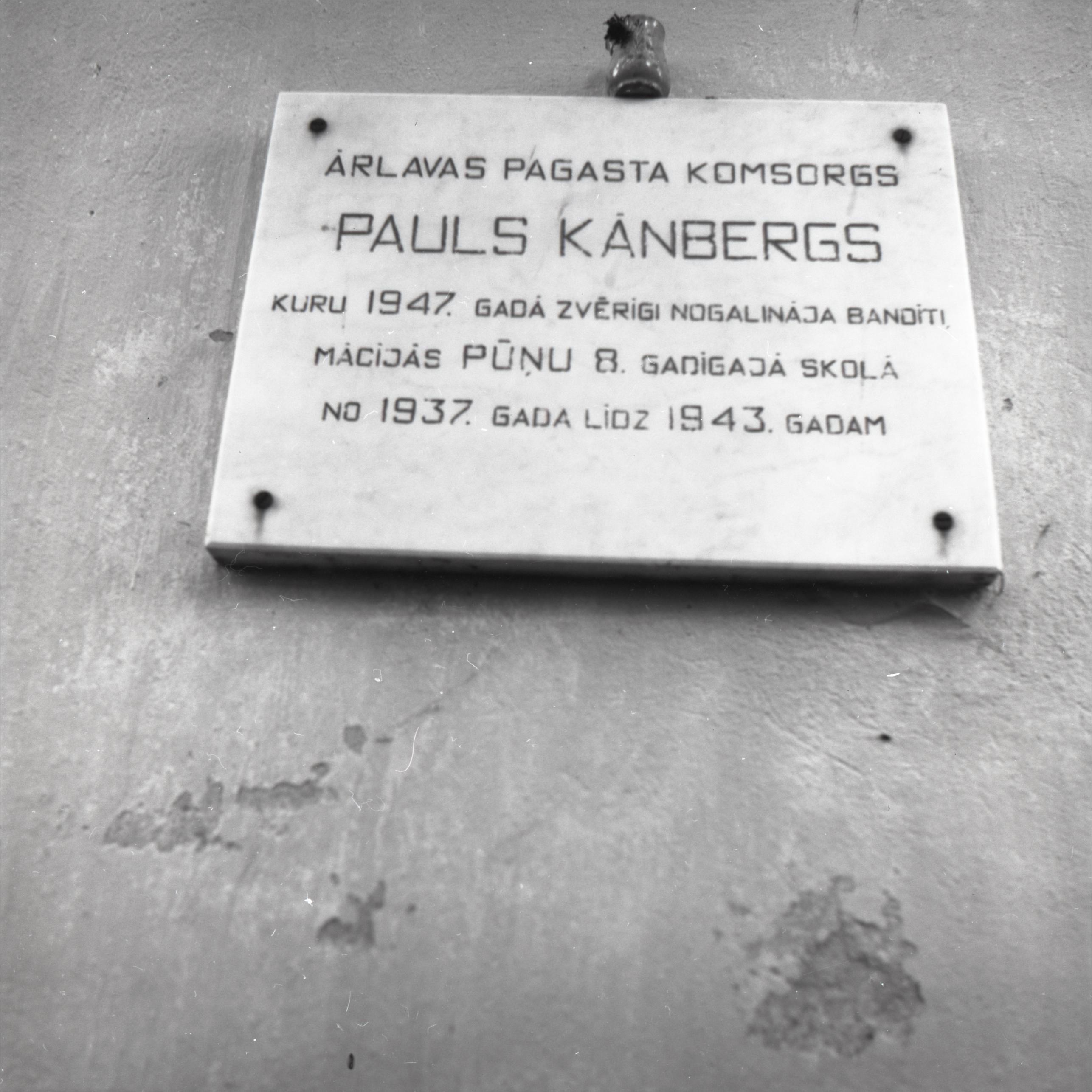 Pūņu pamatskola: Skola, kurā mācījies komjaunatnes organizators Pauls Kanbergs, piemiņas plāksnes tuvplāns