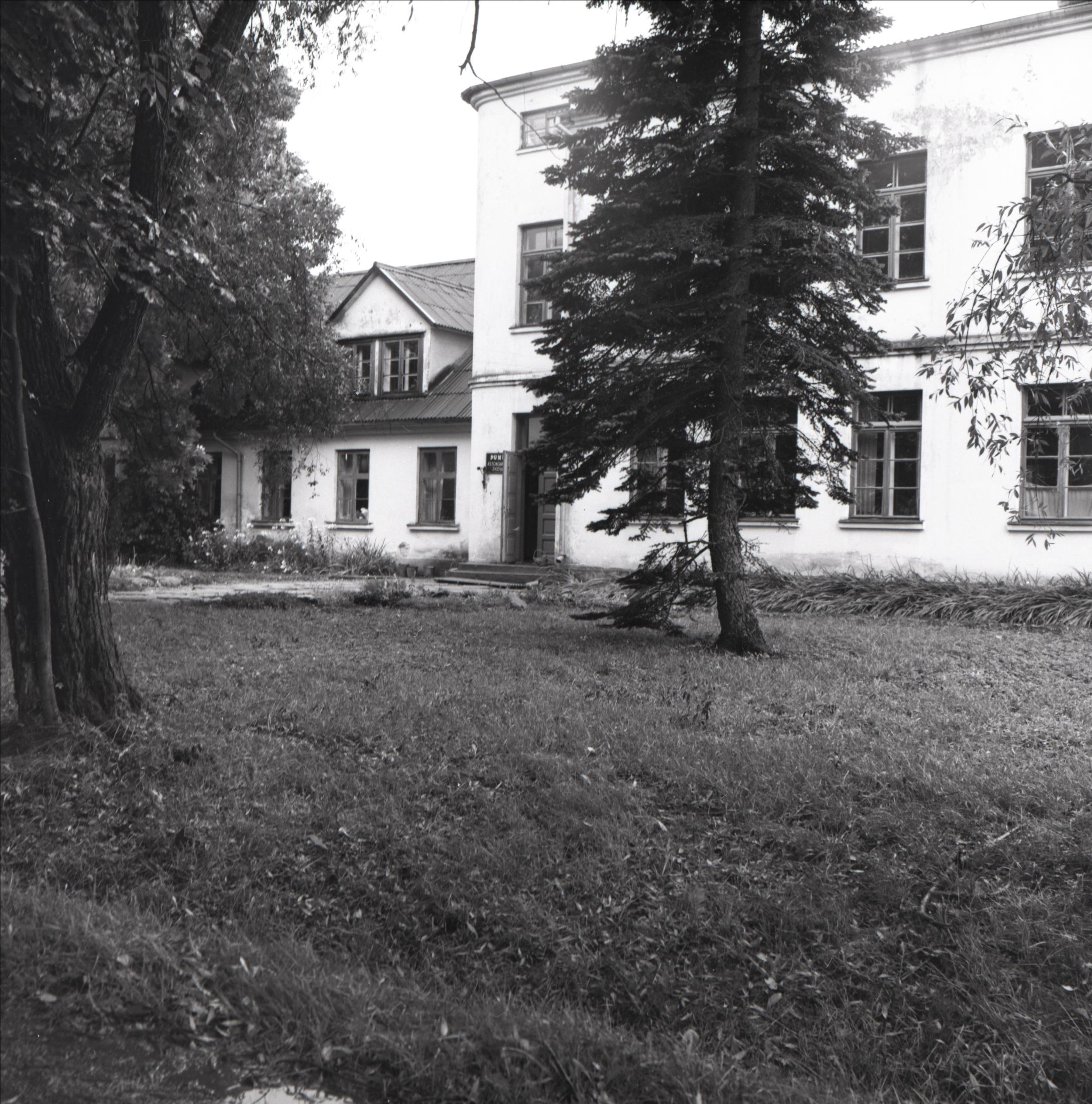 Pūņu pamatskola: Skola, kurā mācījies komjaunatnes organizators Pauls Kanbergs, skats uz skolas ēkas ieeju, skolas ēku daļēji aizsedz koki