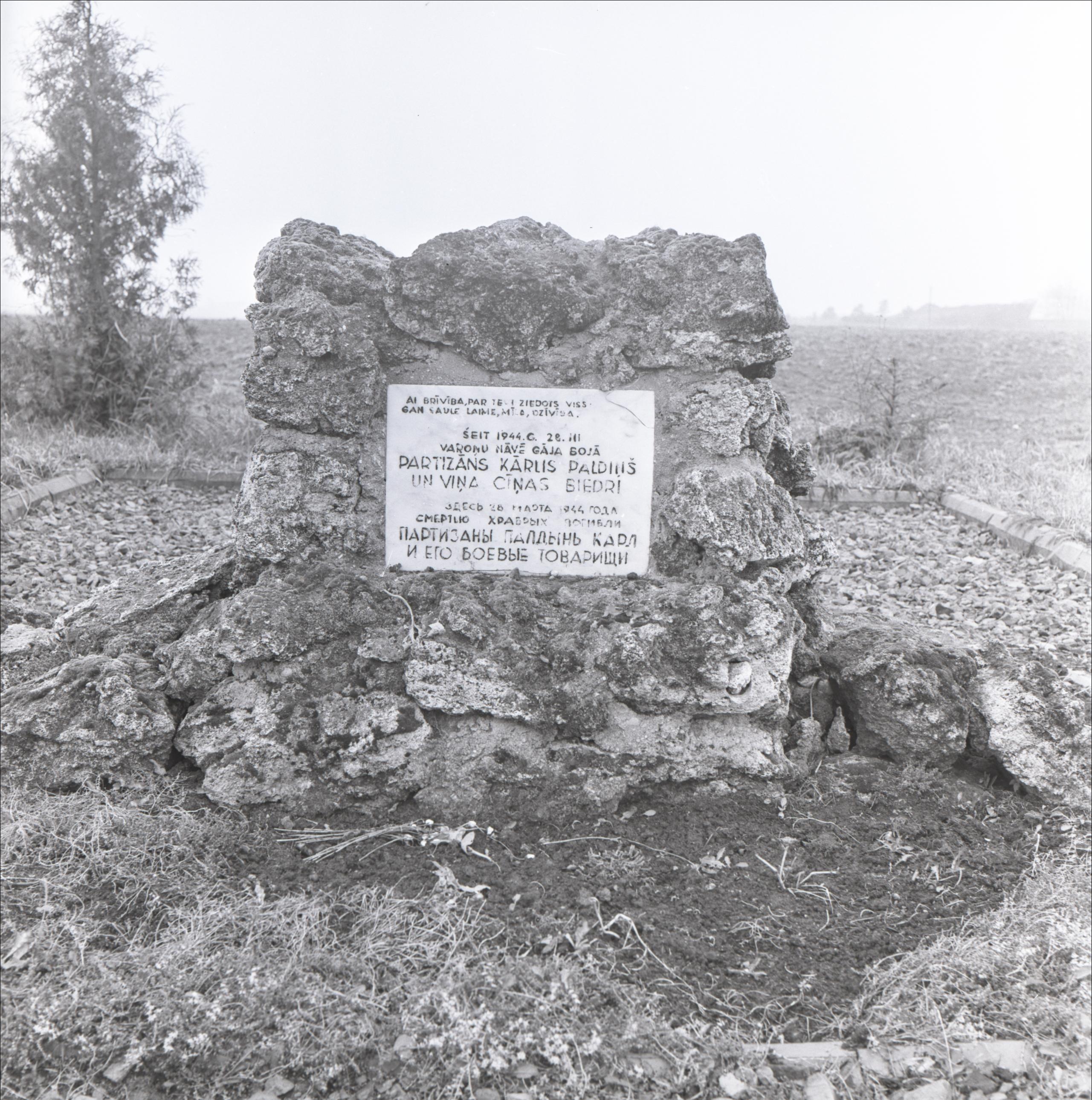 Piemineklis: Kārļa Paldiņa krišanas vieta. Šūnakmens pieminekļa tuvplāns, uz pieminekļa balta marmora plāksne ar tekstiem latviešu un krievu valodās.