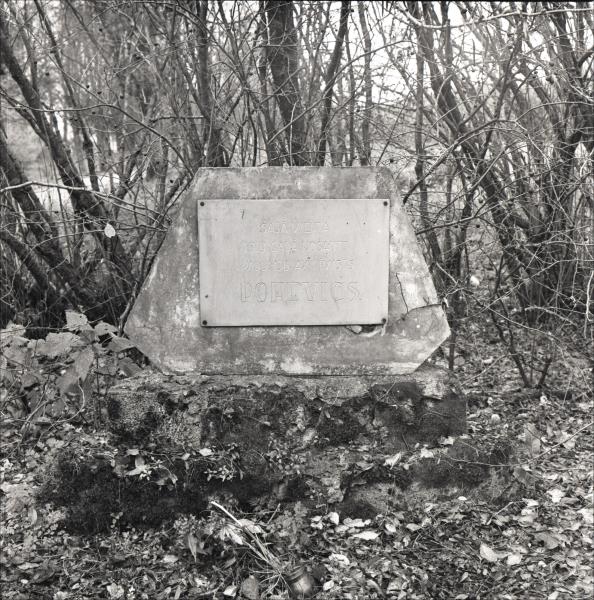 Piemineklis: 1919. gada padomju aktīvista Pohevica nošaušanas vieta. Pieminekļa tuvplāns, uz betona pieminekļa metāla plāksne ar uzrakstu. Fonā krūmi.