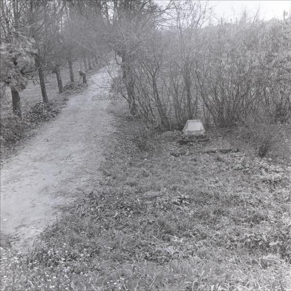 Piemineklis: 1919. gada padomju aktīvista Pohevica nošaušanas vieta. Skats uz pieminekli no Kuldīgas ielas puses. Blakus gājēju celiņš ar koku aleju, tālumā cilvēks grābj lapas.