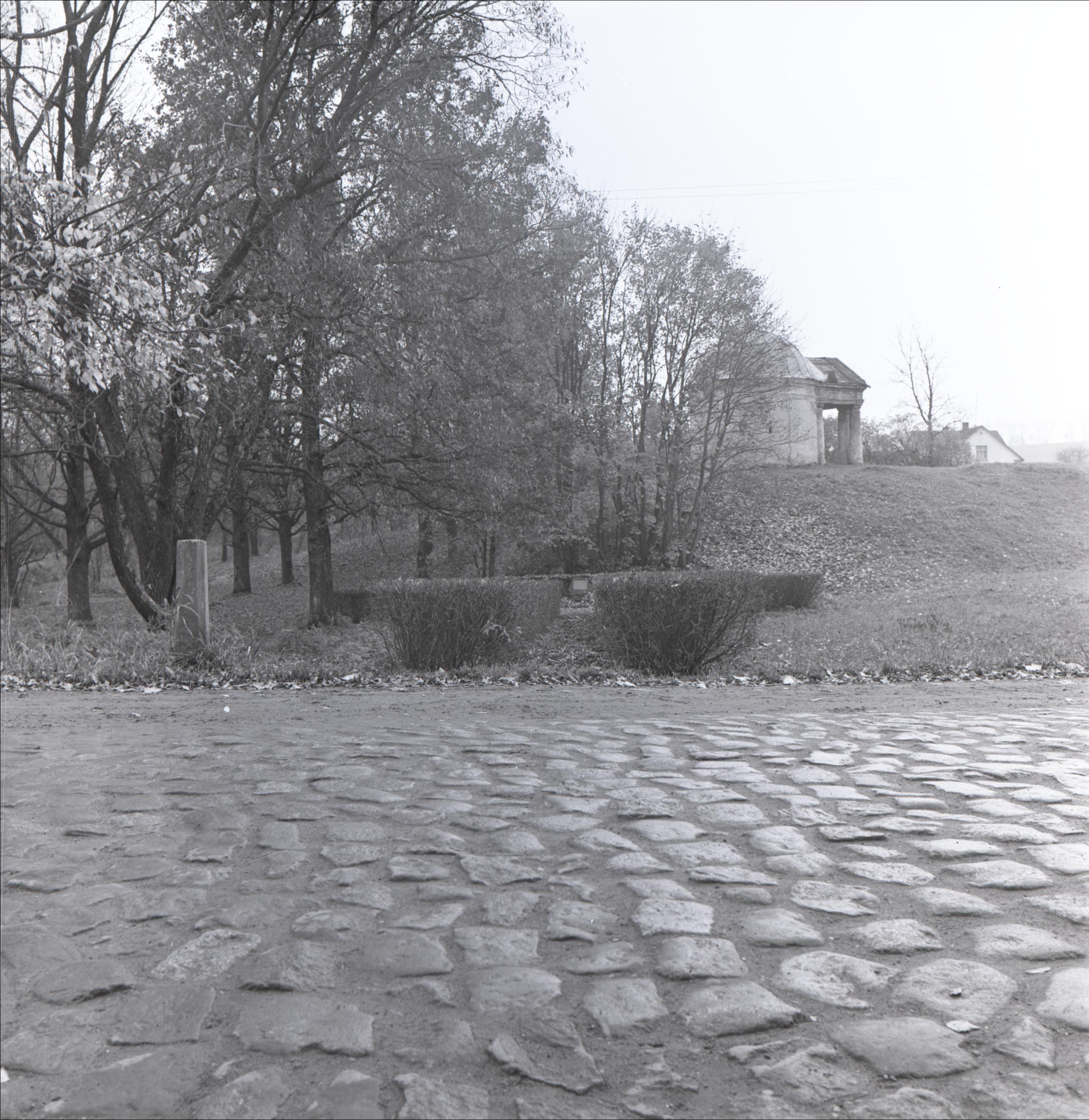 Piemineklis: 1919. gada padomju aktīvistu Robata un Flencendorfa nošaušanas vieta. Skats uz pieminekli no Lāčplēša ielas, iela bruģēta, ap pieminekli apstādīts dzīvžogs. Fonā redzama Brinkenu kapliča.