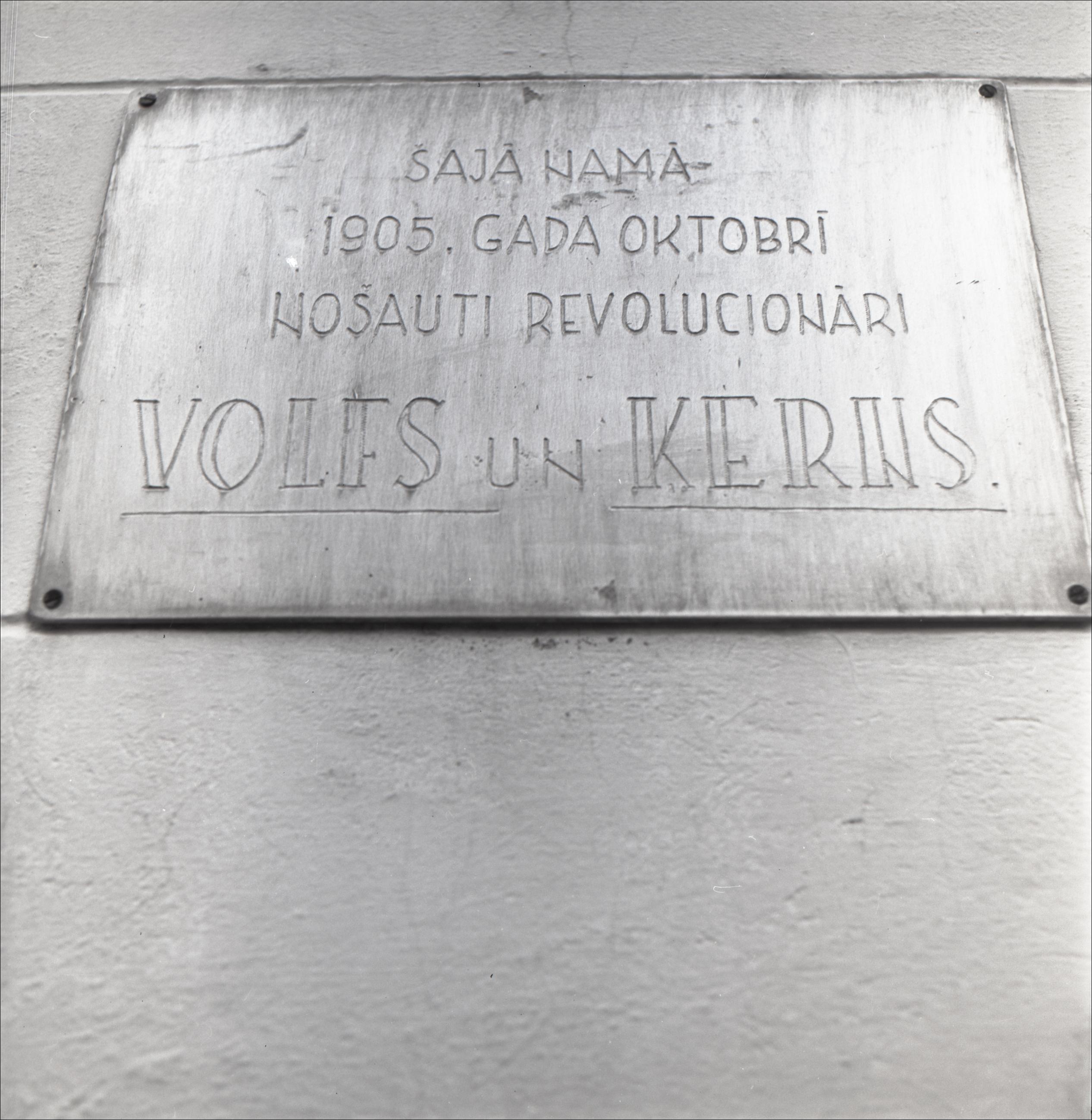 Kultūras nams: Kultūras nams, kurā 1905. gadā nošauti revolucionāri Volfs un Kerns. Metāla piemiņas plāksnes tuvplāns.