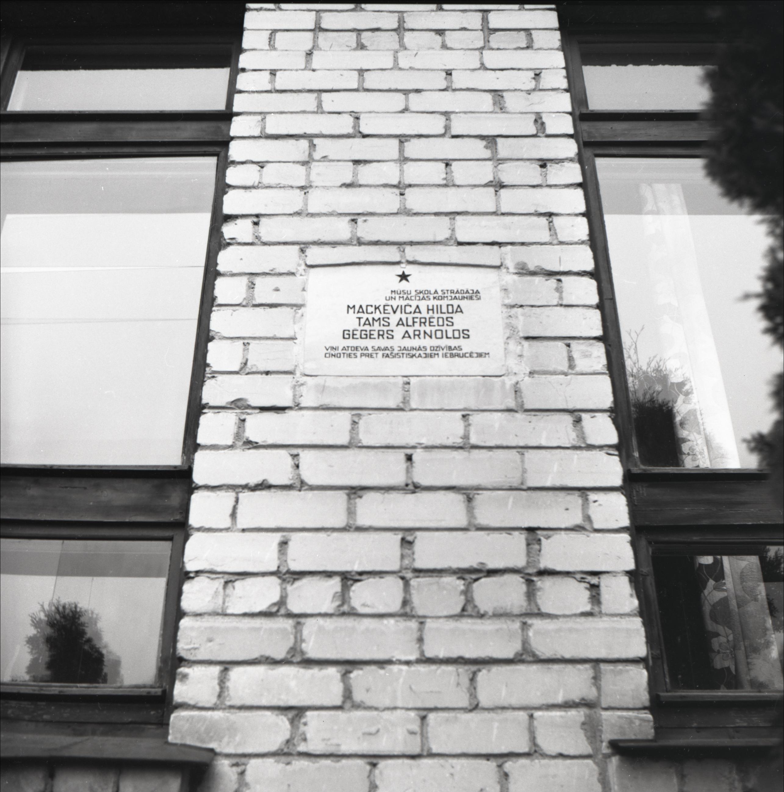 Sabiles pamatskola: Sabiles pamatskola. Piemiņas plāksne skolā strādājošajiem un studējošajiem komjauniešiem, tuvplāns. Plāksne uz atsegtu ķieģeļu sienas, tās augšā piecstaru zvaigzne.
