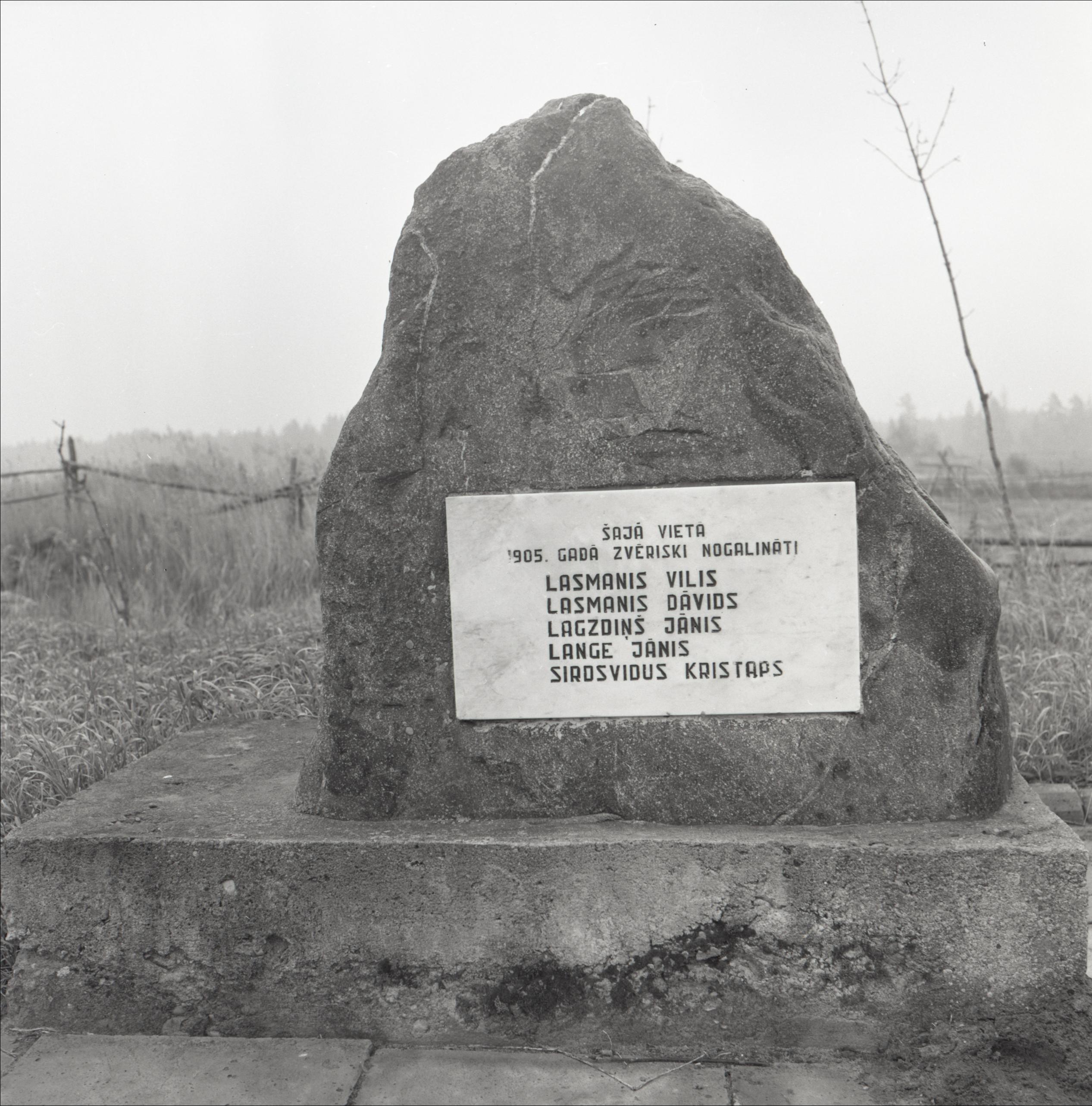 Piemineklis: 1905. gada revolucionāru nošaušanas vieta. Pieminekļa tuvplāns, uz akmens balta marmora plāksne ar nošauto revolucionāru vārdiem.