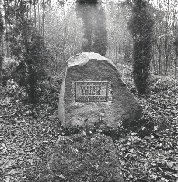 Nodenu kapi: Oļģerta Lauča kapa vieta un piemineklis. Kapa vietas tuvplāns, kapa vieta ar betona apmali. Akmens piemineklis ar slīpēta granīta piemiņas plāksni.