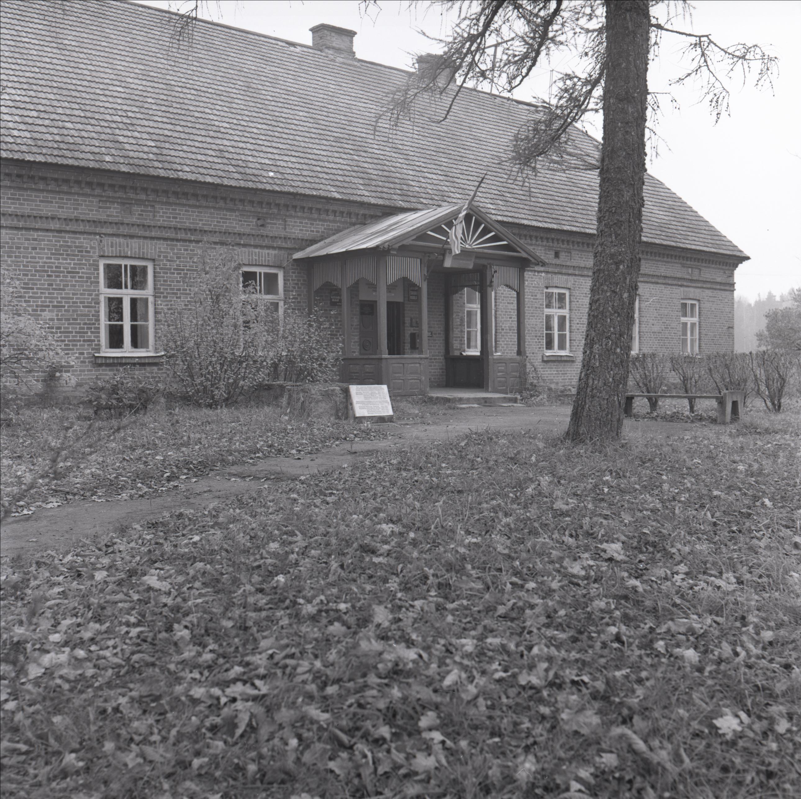 Administratīvā ēka: Nogalināto komjauniešu piemiņas plāksne pie Ģibuļu ciema padomes ēkas. Skats uz plāksni no attāluma. Redzama padomes ēkas ieejas fasāde ar lieveni.