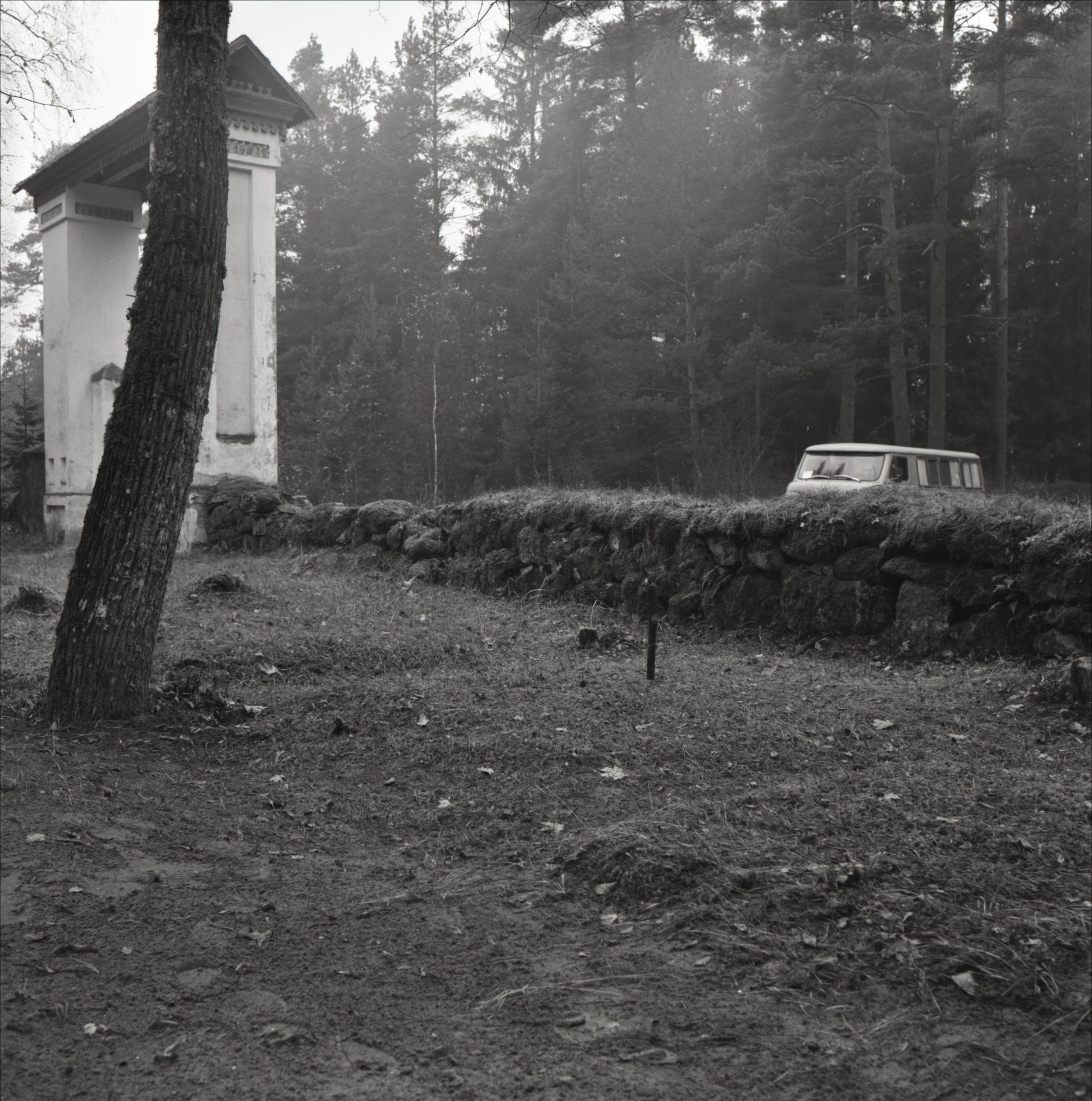 Kalešu kapi: Revolucionāru brāļu Lasmaņu kaps. Redzams akmens mūris apkārt kapiem un kapu vārti. Aiz mūra tālumā mežs un busiņš.
