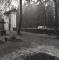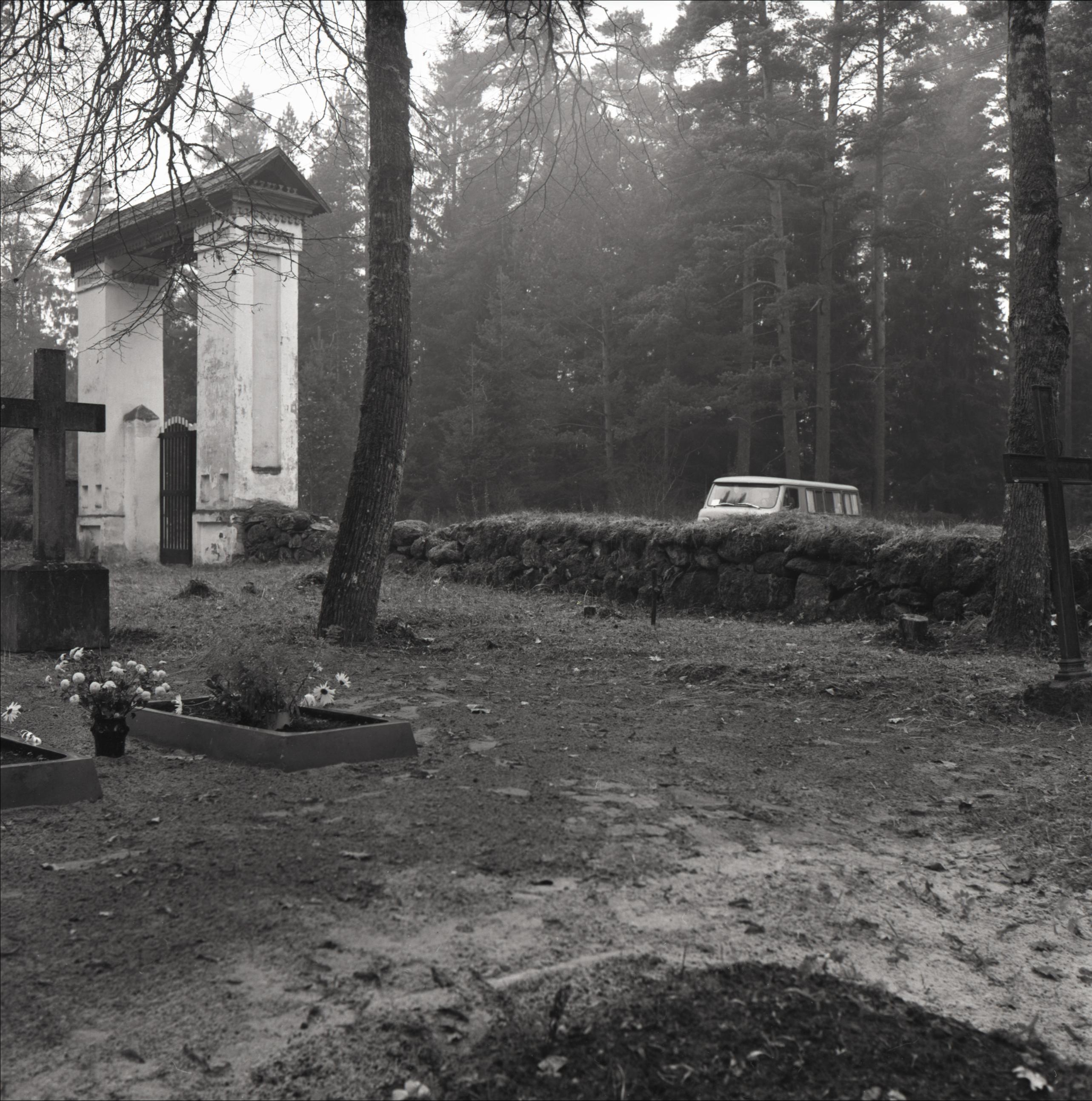 Kalešu kapi: Revolucionāru brāļu Lasmaņu kaps. Redzamas kapu kopas ar apmalēm un bez pieminekļiem, krusti. Fonā akmens mūris apkārt kapiem un kapu vārti. Aiz mūra tālumā mežs un busiņš.