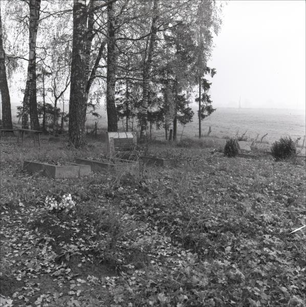 Bāļu kapi: Komjaunieša Rūdolfa Brinkmaņa kapa vieta un piemineklis. Kapa vietai betona apmale, blakus redzamas kapa vietas bez pieminekļiem, fonā koki un pļava.