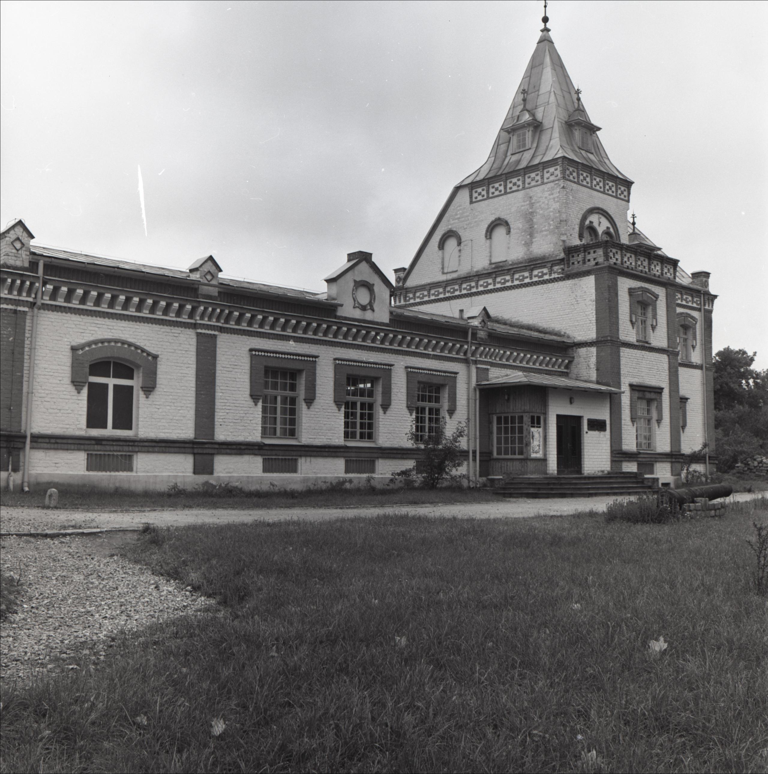 Doles muižas apbūve: Kungu māja, skats uz galveno fasādi. netālu no kungu mājas ieejas redzams 17. gs. lielgabals