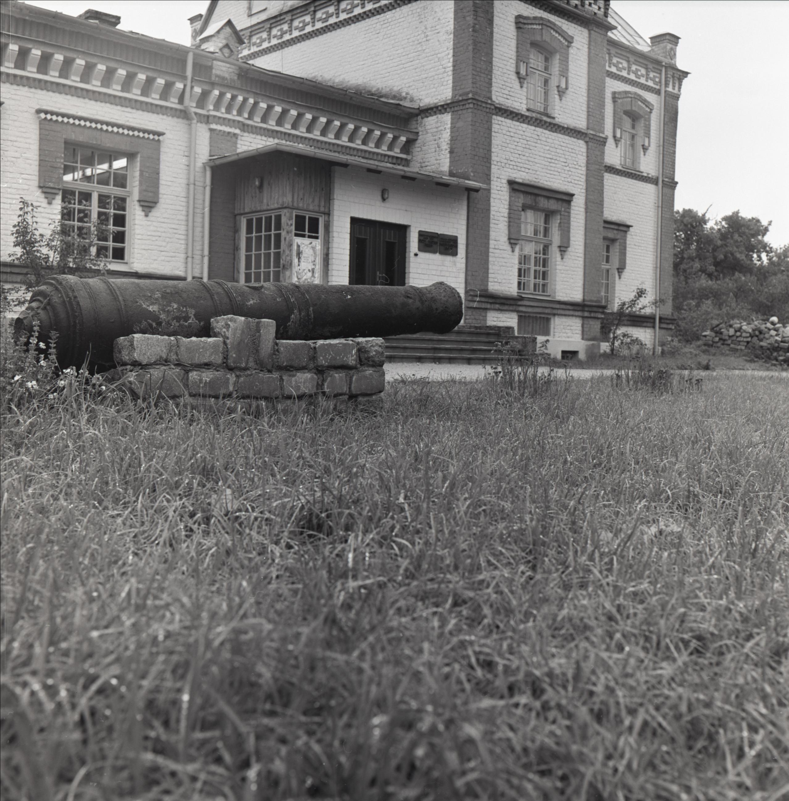Doles muižas apbūve: 17. gs lielgabals, tuvplāns. Lielgabals novietots uz mūrētas akmens ķieģeļu pamatnes. Fonā Doles muižas kungu māja.