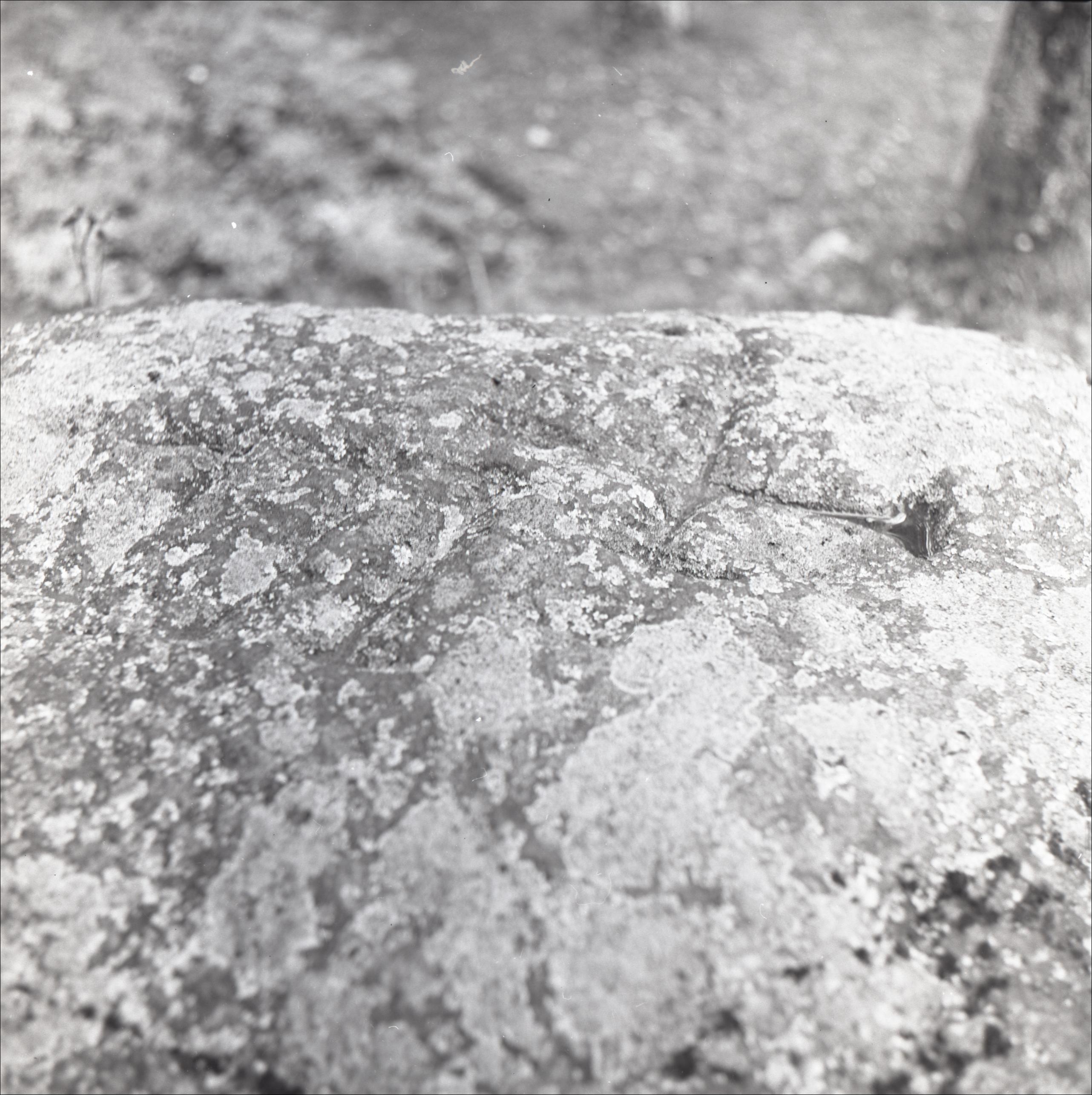 Akmens Doles salā: Robežakmens, akmens tuvplāns. Redzams iegrebts krusts.