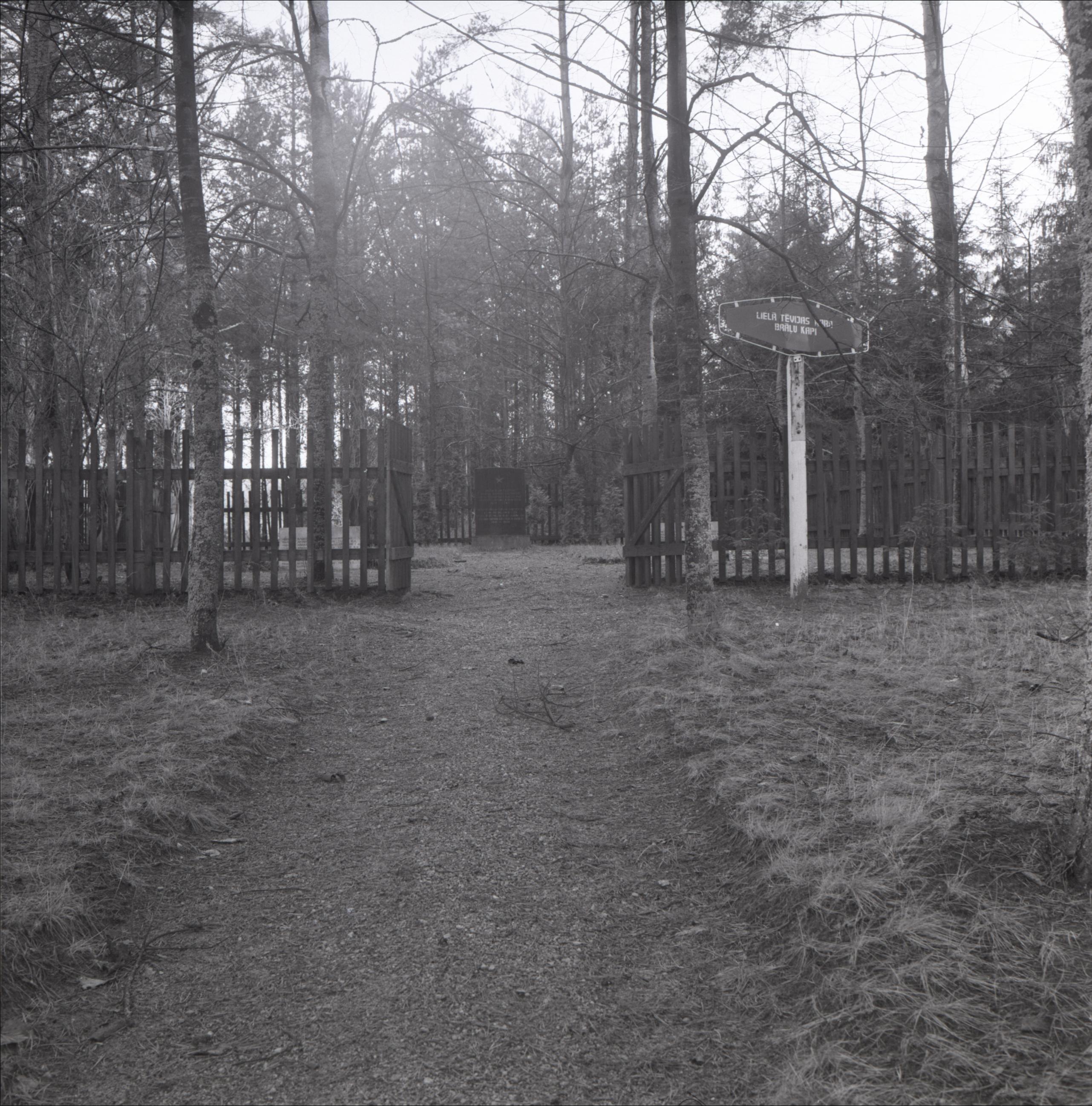 Padomju karavīru kapi "Mellupi": Skats uz kapiem ārpus žoga. Tālumā redzams piemineklis, pie ieejas stabs ar zīmi "LTK brāļu kapi". Fonā koki.