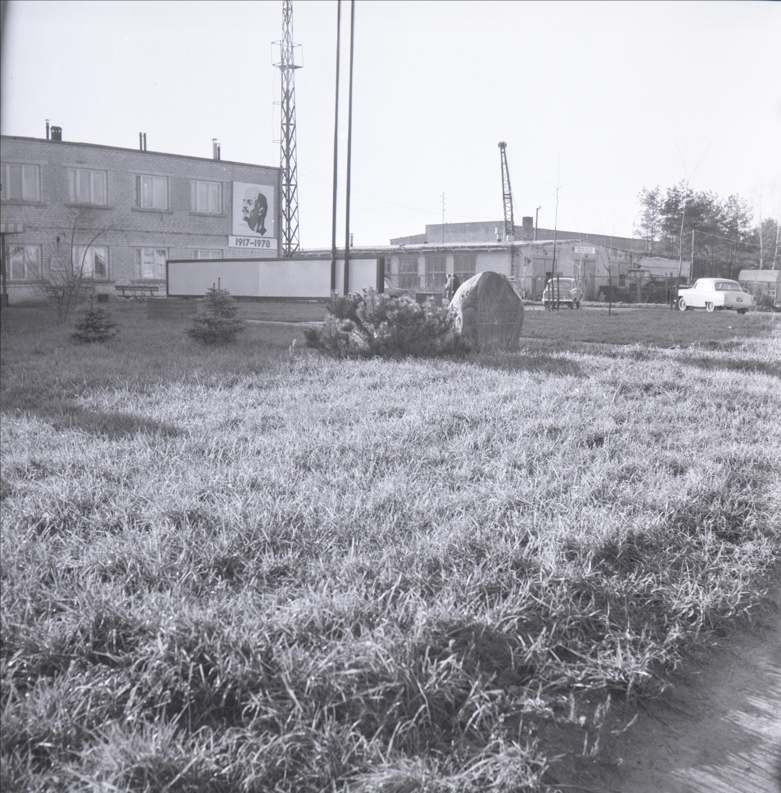 Piemiņas akmens: Piemiņas akmens pie kolhoza kantora. Pie akmens skuju krūmu apstādījumi. Fonā redzama kolhoza kantora ēka, uz tās sienas plakāts ar Ļeņina portretu. Labajā attēla pusē redzamas automašīnas.
