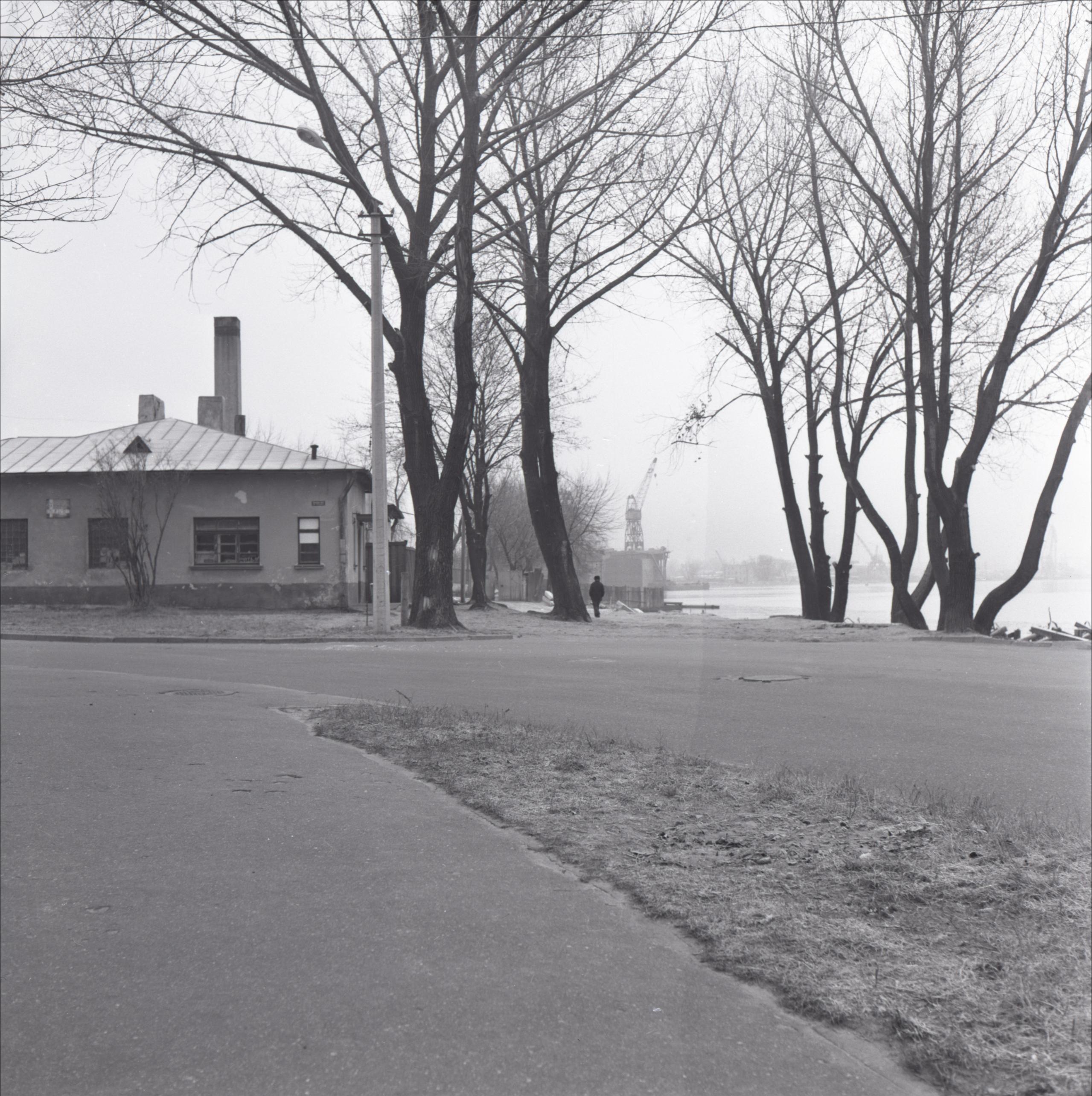 1919. gada cīnītāju šaušanas vieta Vecmīlgrāvī: Kreisajā attēla pusē redzama vienstāva ēka. Priekšplānā iela. Labajā pusē fonā redzama Sarkandaugavas upe un gar krastu koku rinda. Tālumā redzams ceļamkrāns.