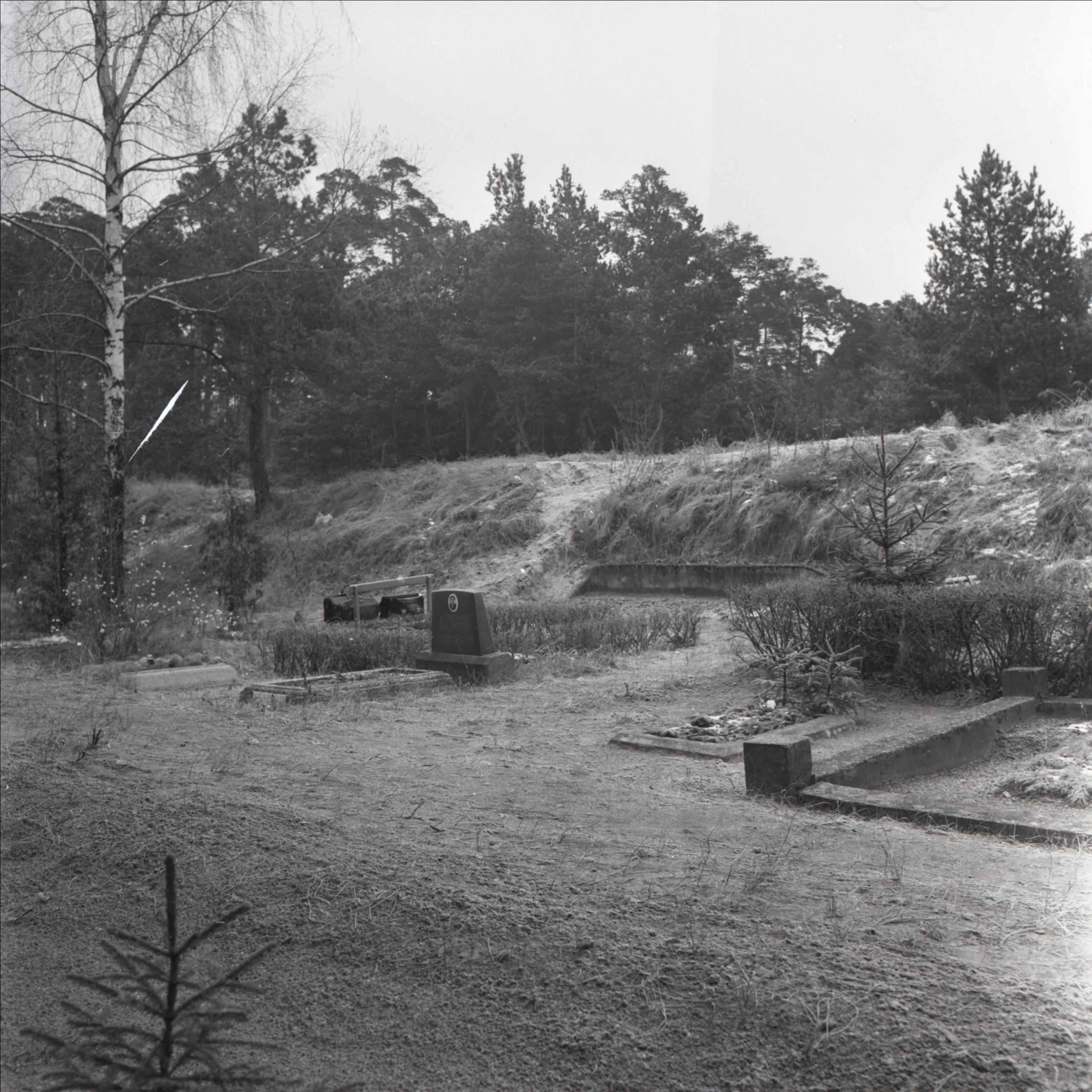 Vecmīlgrāvja kapi: 1919. gada cīnītāju kaps. Kaps redzams tālumā, uzkalniņa apakšā. Tam priekšā citas kapu kopas un pieminekļi, fonā priežu mežs.