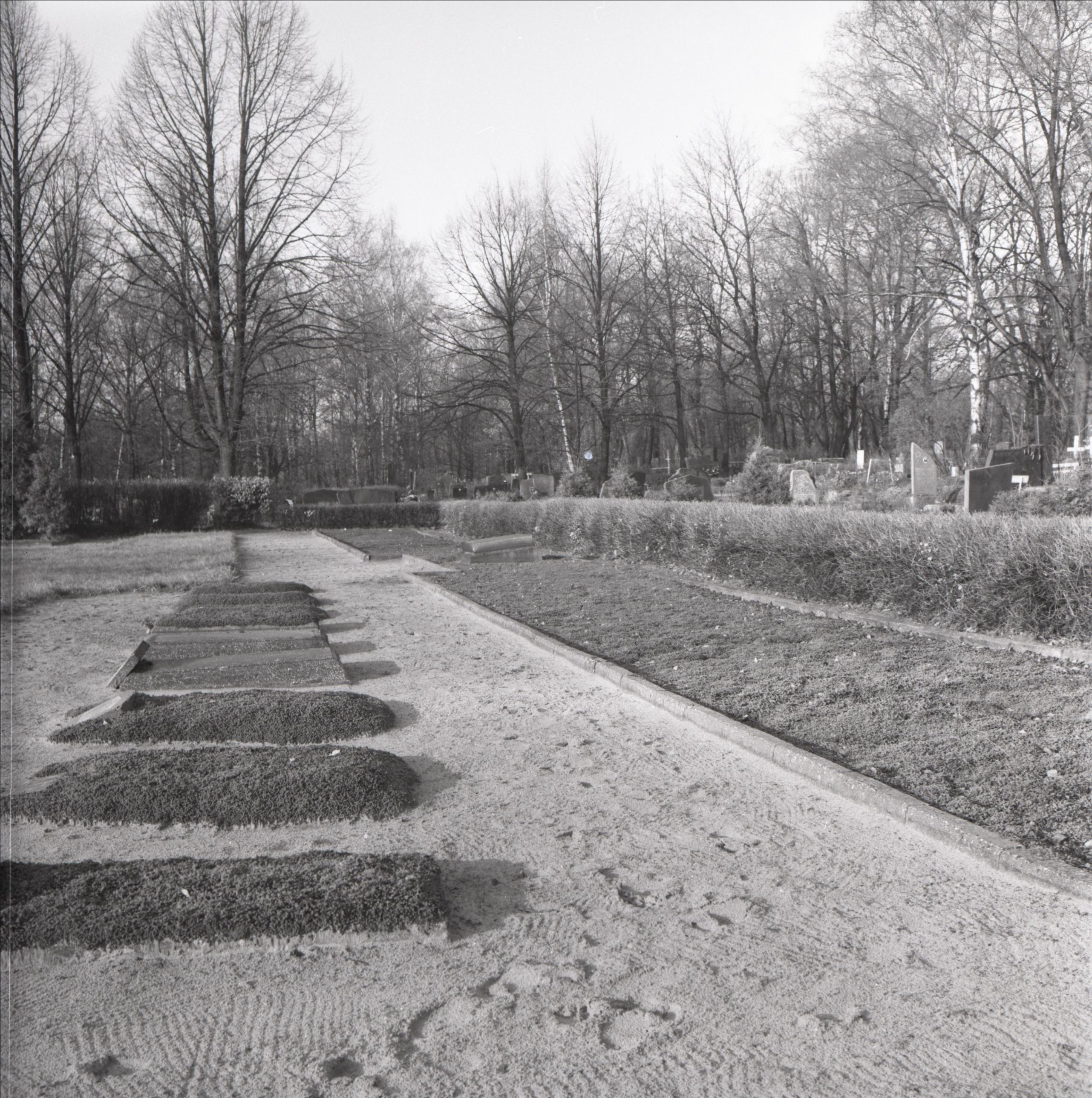 Miķeļa kapi: Fašisma upuru kapi. Priekšplānā kapa kopas bez apmalēm, pie dažām novietotas plāksnes. Tālumā redzama lielāka kapa plāksne. Fonā citi kapi un pieminekļi.