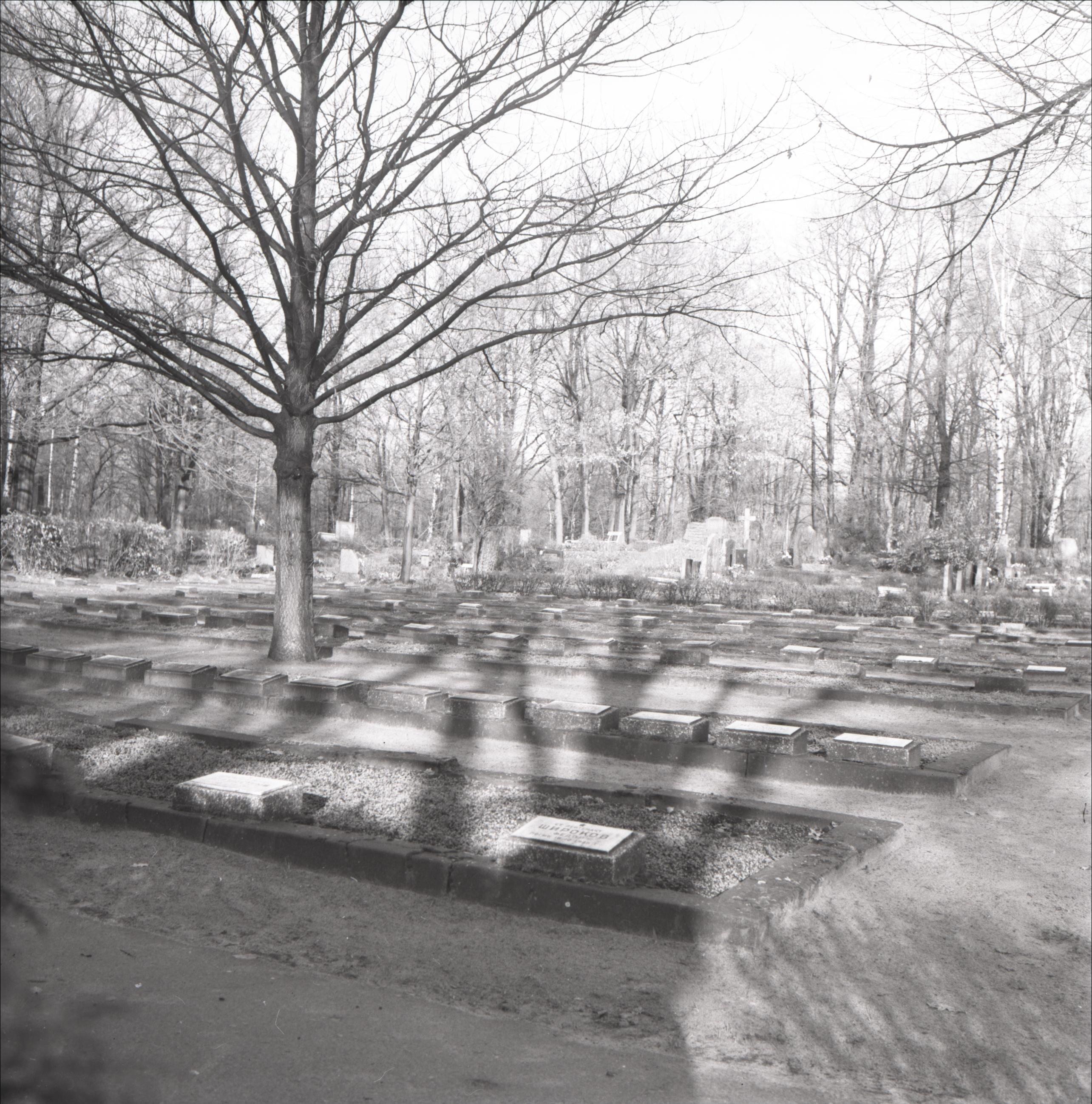 Miķeļa kapi: 2. pasaules karā kritušo kapi. Redzamas rindas ar kapa plāksnēm. Fonā koki un citi kapi un pieminekļi.