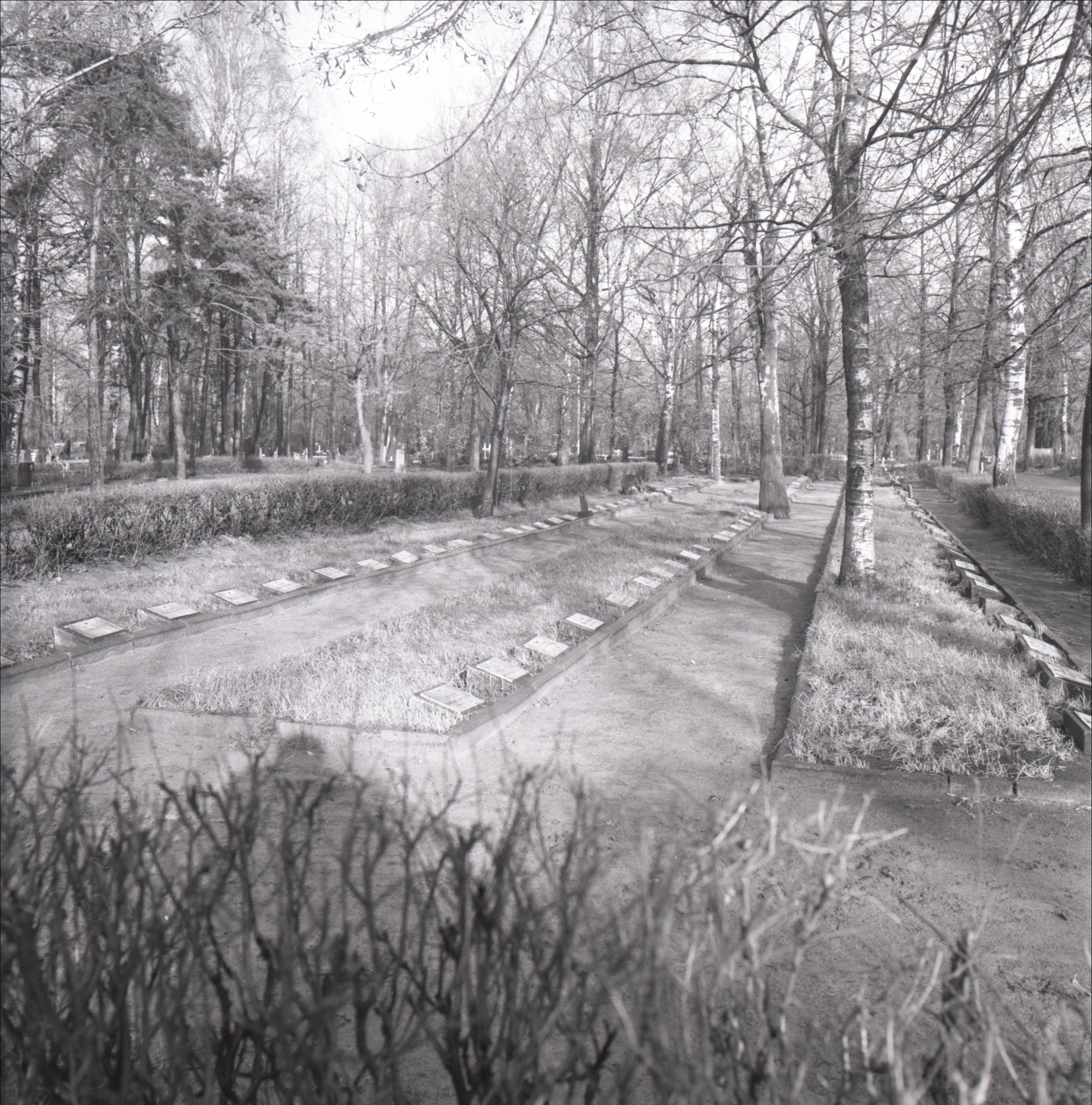 Miķeļa kapi: 2. pasaules karā kritušo kapi. Redzamas rindas ar kapa plāksnēm. Fonā koki un citi kapi un pieminekļi.