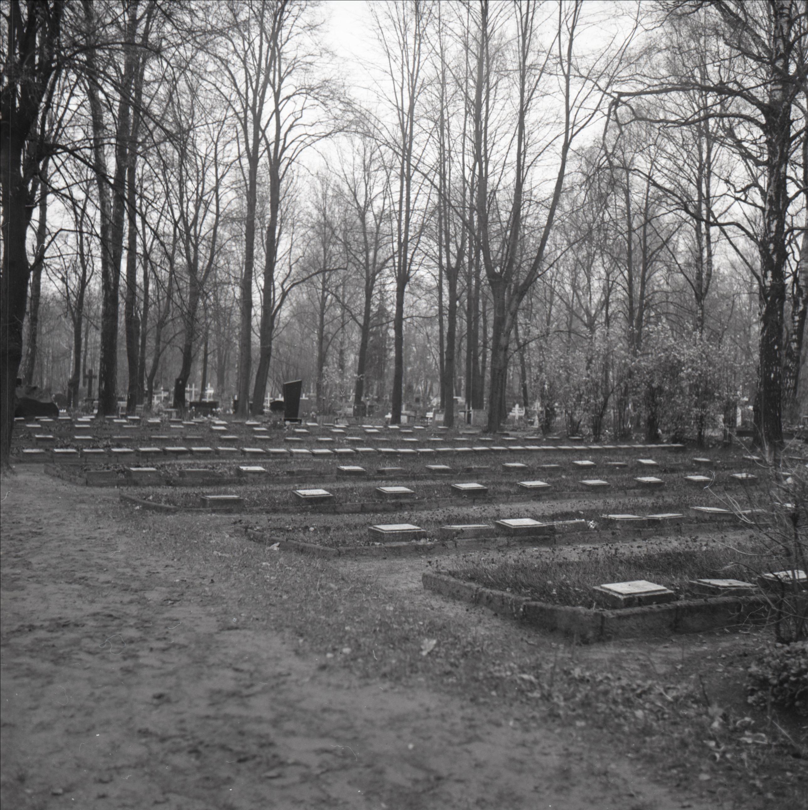 Miķeļa kapi: 2. pasaules karā kritušo kapi. Redzamas rindas ar kapa plāksnēm. Fonā koki un citi kapi un pieminekļi.