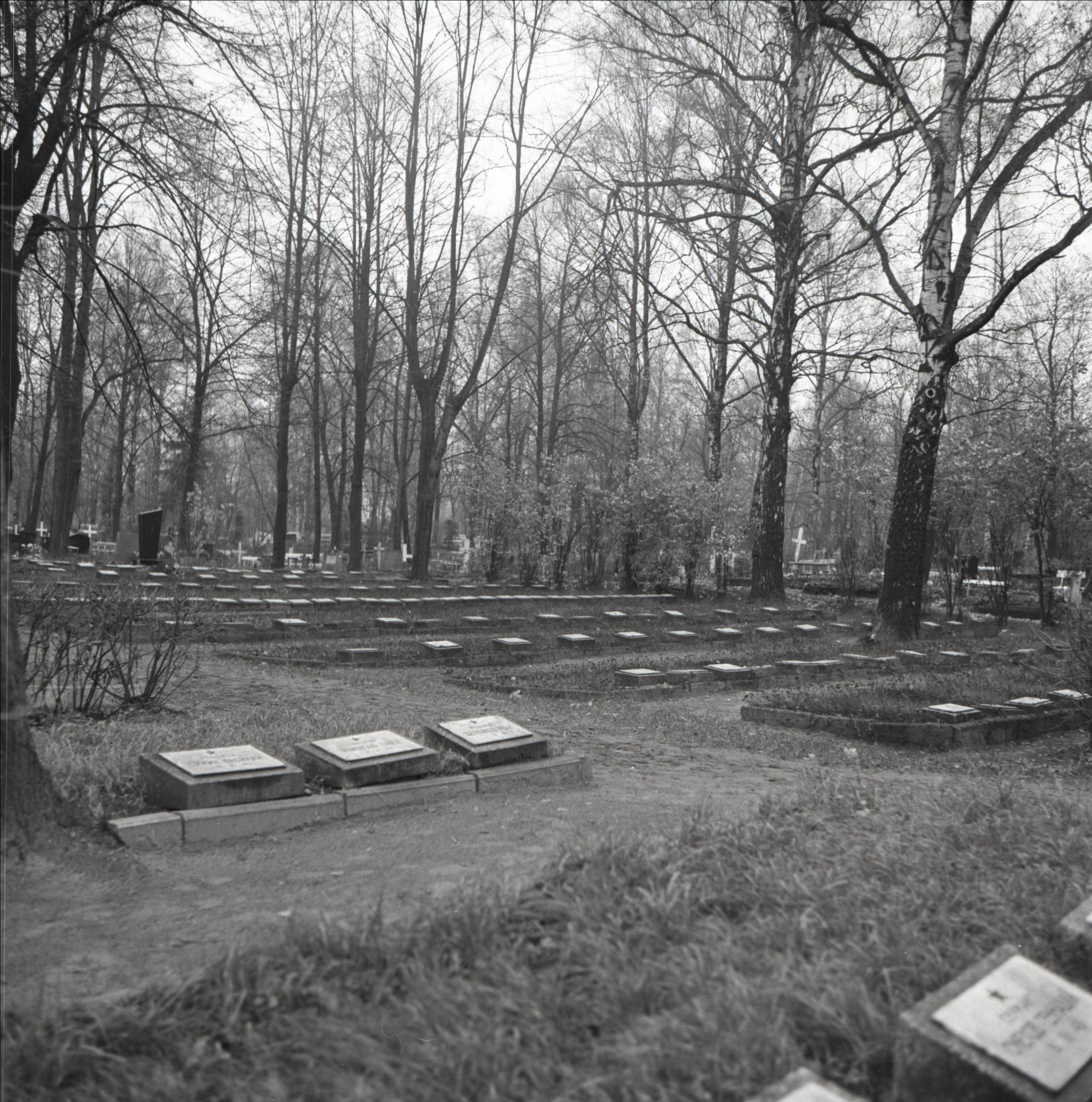 Miķeļa kapi: 2. pasaules karā kritušo kapi. Redzamas rindas ar kapa plāksnēm. Fonā koki un citi kapi un pieminekļi.