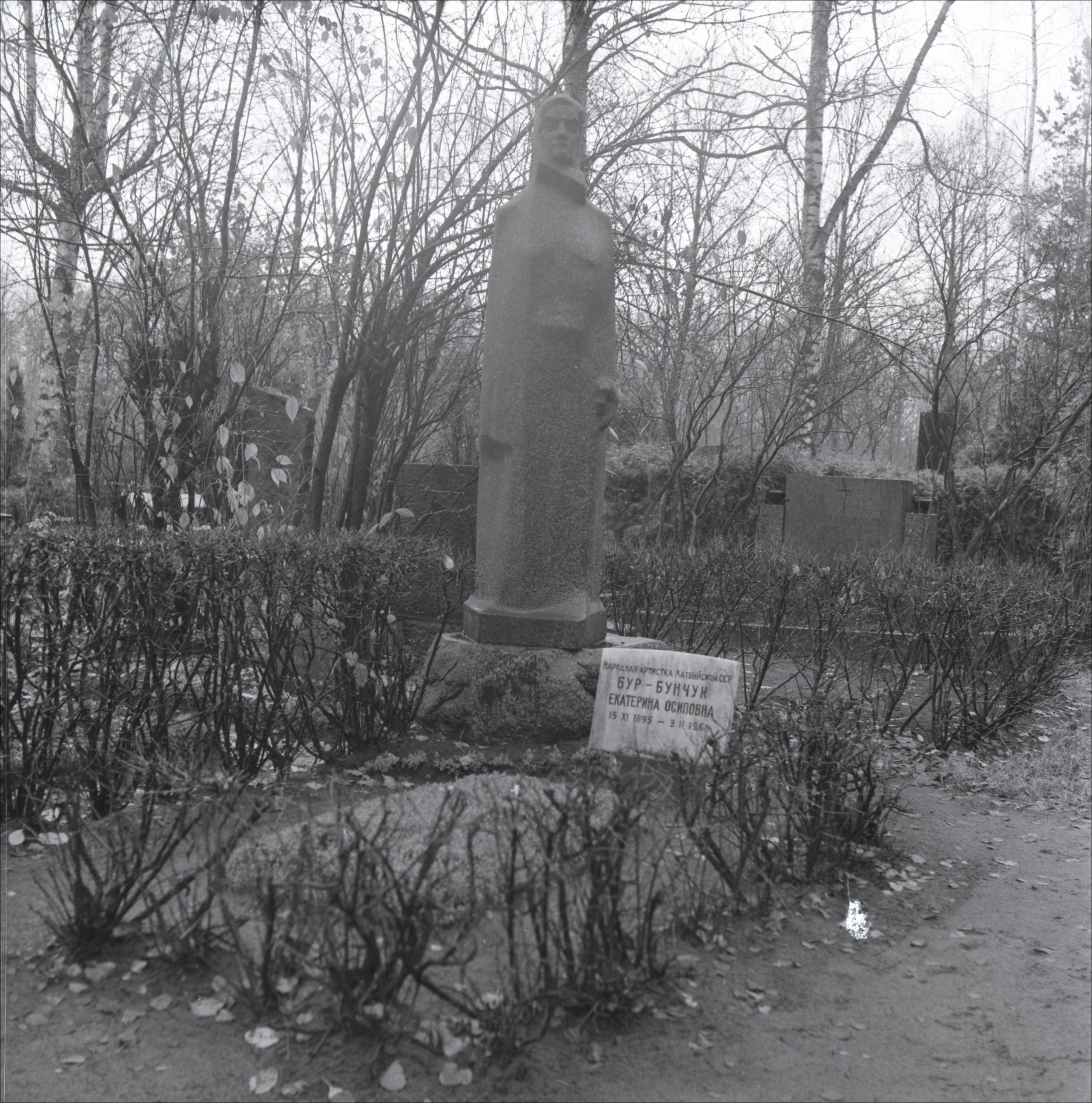 Raiņa kapi: Jekaterinas Bunčukas kaps. Kapa kopa bez apmales, pie kapa balta plāksne ar J. Bunčukas dzīves datiem, teksts uz plāksnes krievu valodā. Pie kapa akmens piemineklis stāvošas sievietes veidolā. Ap kapa vietu dzīvžogs, fonā citi kapi un pieminekļi.