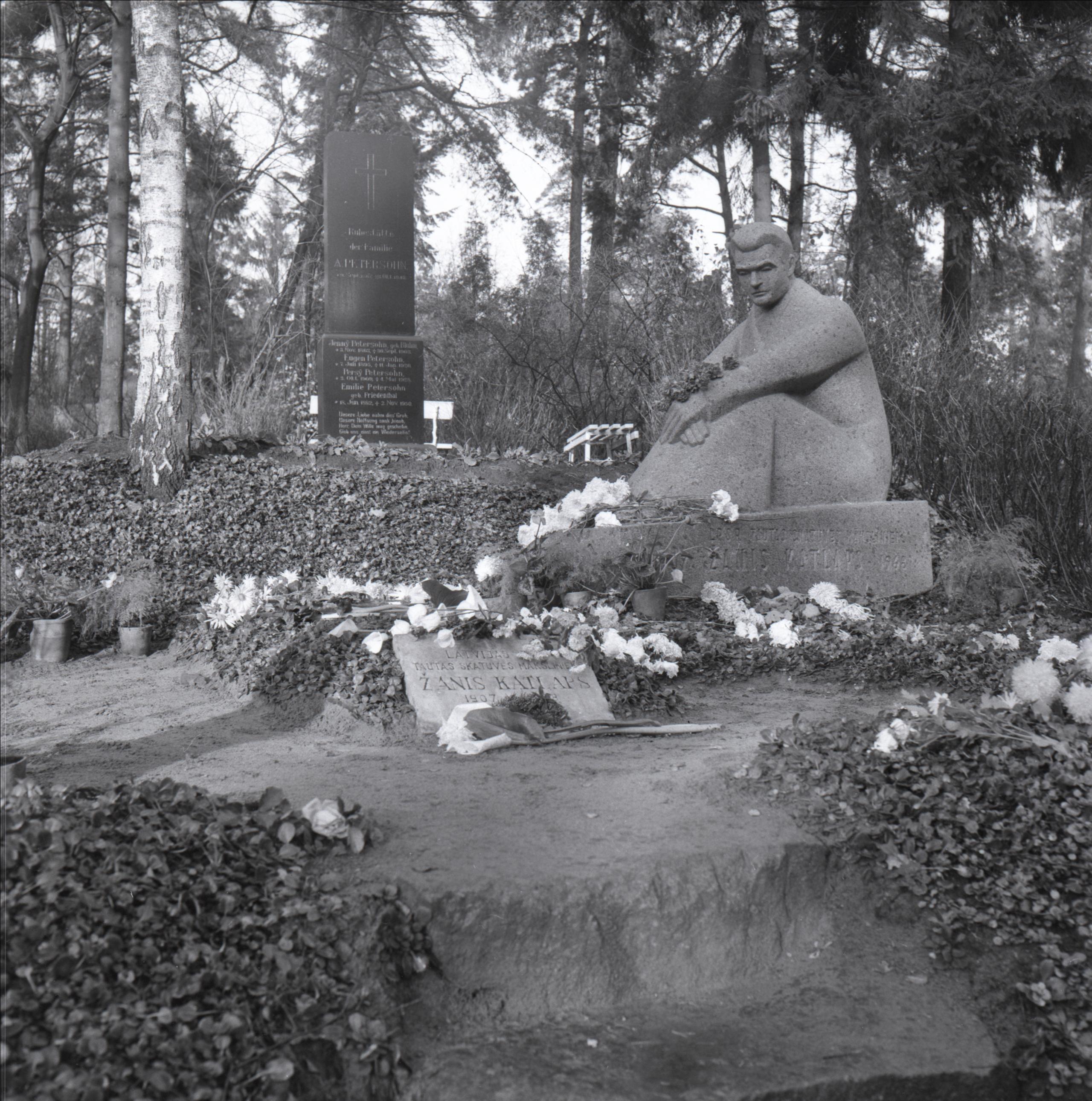 1. Meža kapi: Žaņa Katlapa kaps un un piemineklis. Akmens piemineklī attēlota uz zemes sēdoša vīrieša figūra. Figūra novietota uz taisnstūra pamatnes. Pie un uz pieminekļa novietoti ziedi. Pie pieminekļa balta plāksne ar Ž. Katlapa dzīves datiem. Uz kapu ved akmens pakāpieni. Fonā koki un liels tumša akmens piemineklis.